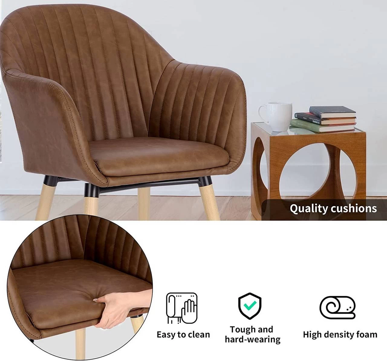 - Robuster Sessel: Bezogen mit strapazierfähigem und wasserabweisendem Kunstleder im Vintage-Stil, eine hochverdichtete Schaumstoffpolsterung, ein gekreuztes Metallgestell und robuste Massivholzbeine. All dies trägt zu einer hohen Stabilität und Langlebigkeit bei. Maximale statische Belastbarkeit: 120 kg.