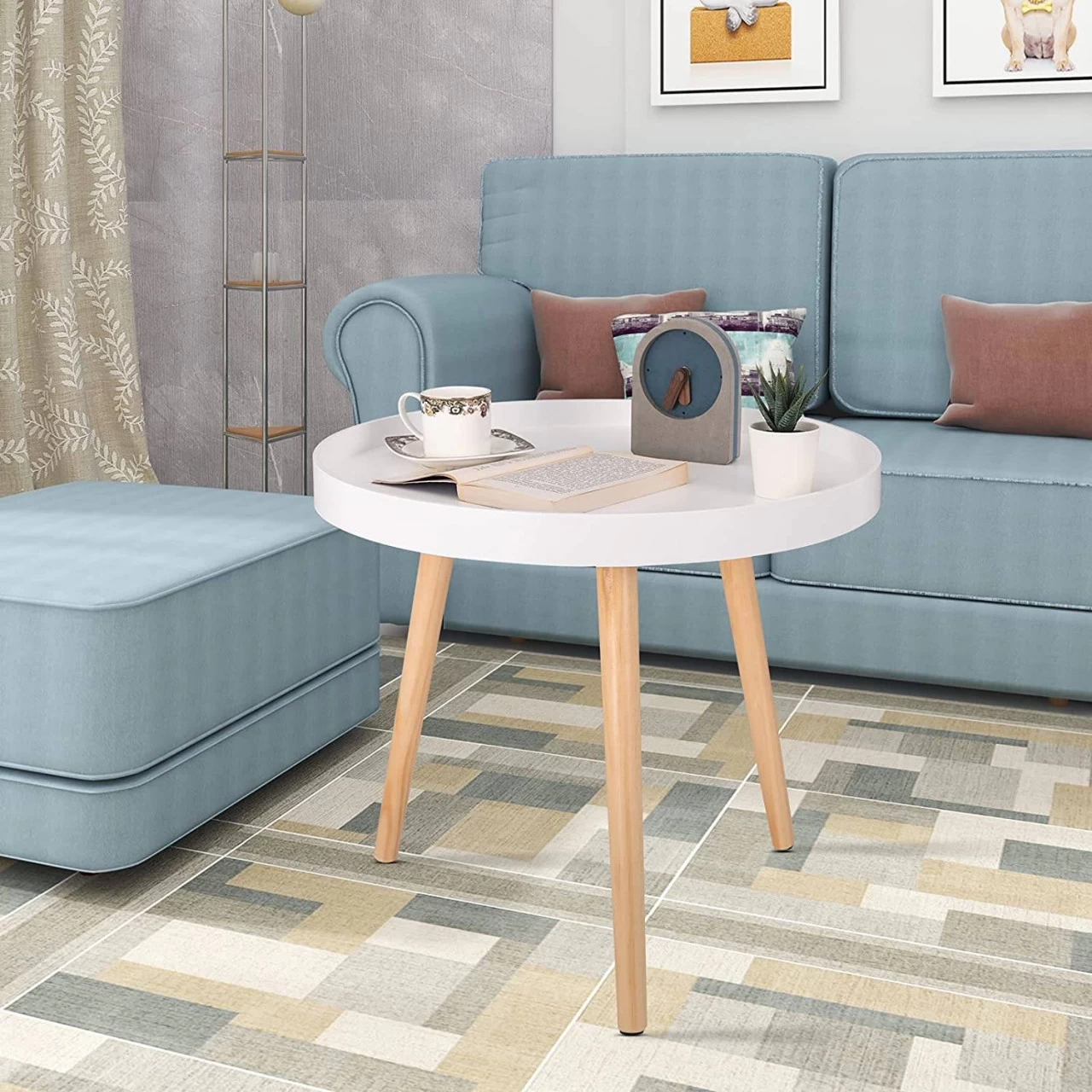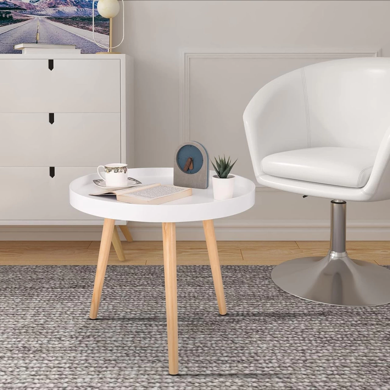 - Sicheres und einfaches Design: Die Tischplatte hat ein rundes Design. Die Oberfläche und die Seiten des Couchtischs sind glatt und ohne scharfe Winkel, wodurch ungewollte Gefahren vermieden werden. Der Schutzrand, der höher als die Tischplatte ist, ist ein praktisches Design, um zu verhindern, dass Gegenstände herunterfallen. Schlichtes Design und die monochrome Kombination können perfekt mit modischen Stilen harmonieren