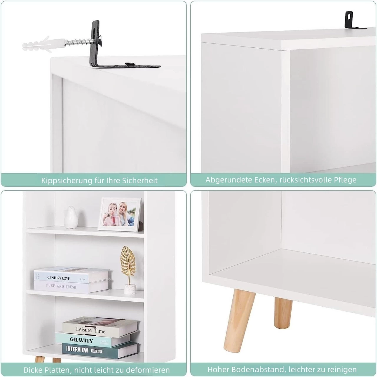 - STABIL & SICHER: Der Kippschutz an der Rückseite und die rutschfesten Pads an den Holzbeinen schützen das offene Bücherregal effektiv vor Wackeln oder Verrutschen und den Boden vor Kratzern, wodurch das Regal stabiler und sicherer im Gebrauch wird