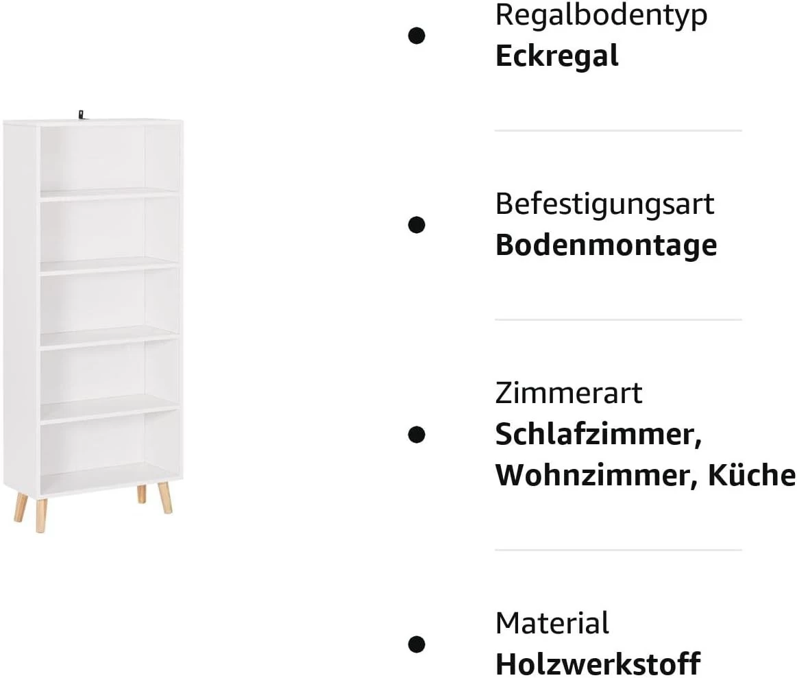 - STARKE & NACHHALTIGE PLATTEN: Das freistehende Bücherregal besteht aus Holzwerkstoff der Klasse E1, ist kratzfest, wasserabweisend und leicht zu reinigen. Die 4 Massivholzbeine halten das unterste Fach trocken und schützen den Inhalt vor Feuchtigkeit