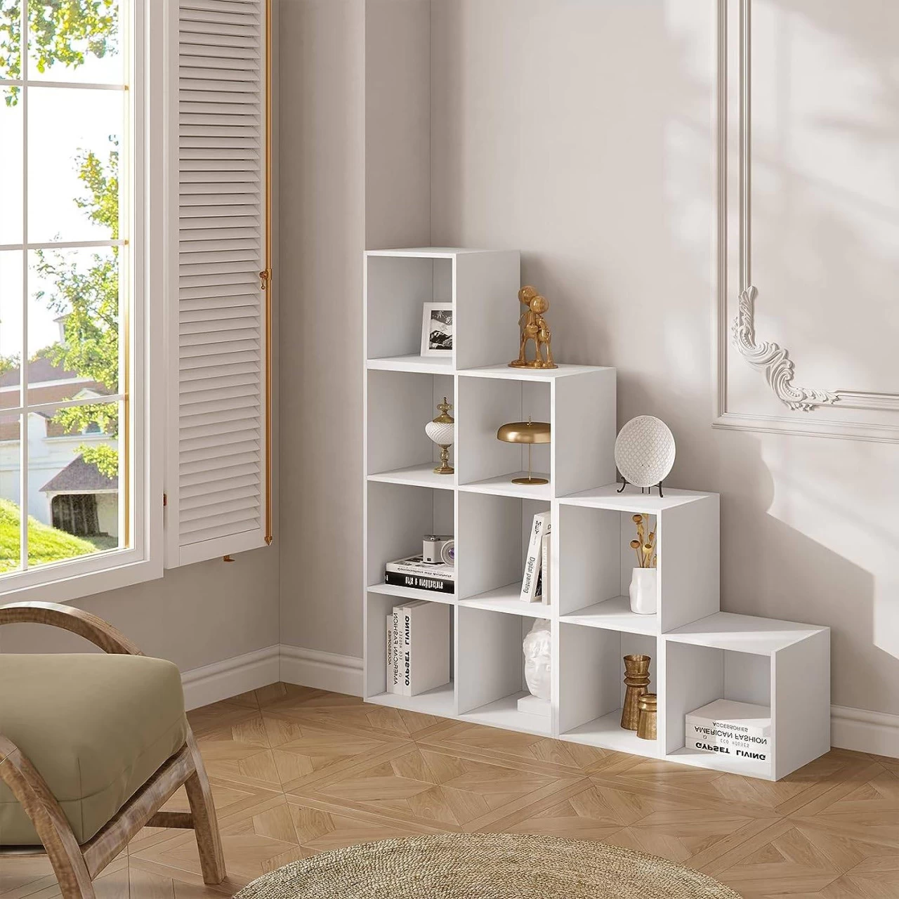 - MULTIFUNKTIONAL &VIELSEITIG: Das Treppenregal zeigt einen einfachen und modernen Look mit einer veränderbaren Form. Dank der Farbelässt es sich im Wohnzimmer, Schlafzimmer, Büro usw. einsetzen undkann auch als Raumteilerverwendet werden