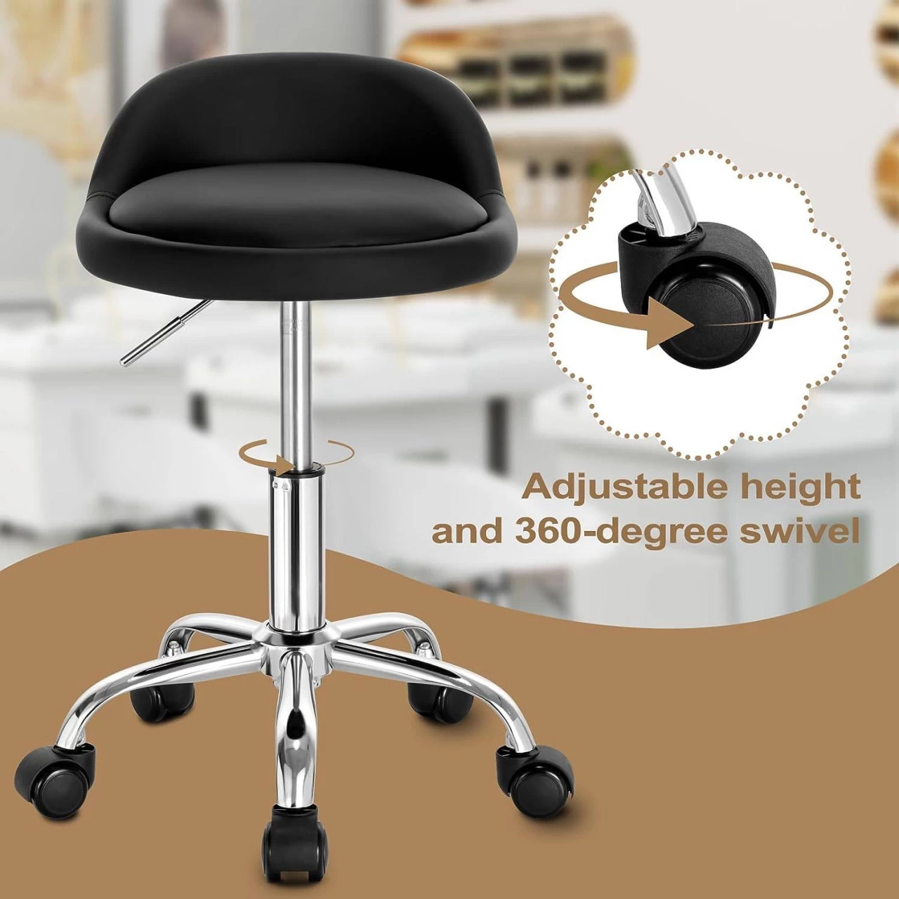 - STABIL & SICHER: Ausgestattet mit einem robusten verchromten Metallfuß hat dieser Drehhocker eine gute Stabilität und eine hohe Belastbarkeit von 120 kg. Die 5 PU-Rollen am Fuß rollen leise, schonen den Boden und hinterlassen keine Spuren