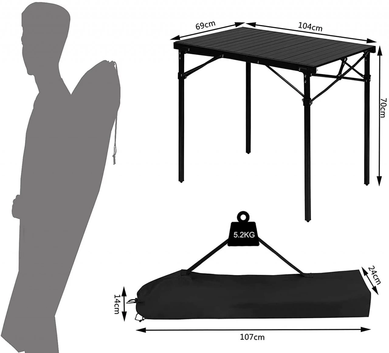 - Praktisch zum Mitnehmen: Der Klapptisch wiegt nur 5,2 kg. Im ausgeklappten Zustand misst er 69 x 70 x 104 cm (B x H x L), zusammengeklappt ist er nur ca. 24 x 14 x 107 cm (B x H x L) groß. Zum einfachen Transport kann er in der mitgelieferten Tragetasche verstaut werden. Perfekt für Campingfreunde, die nicht viel Platz im Kofferraum haben.