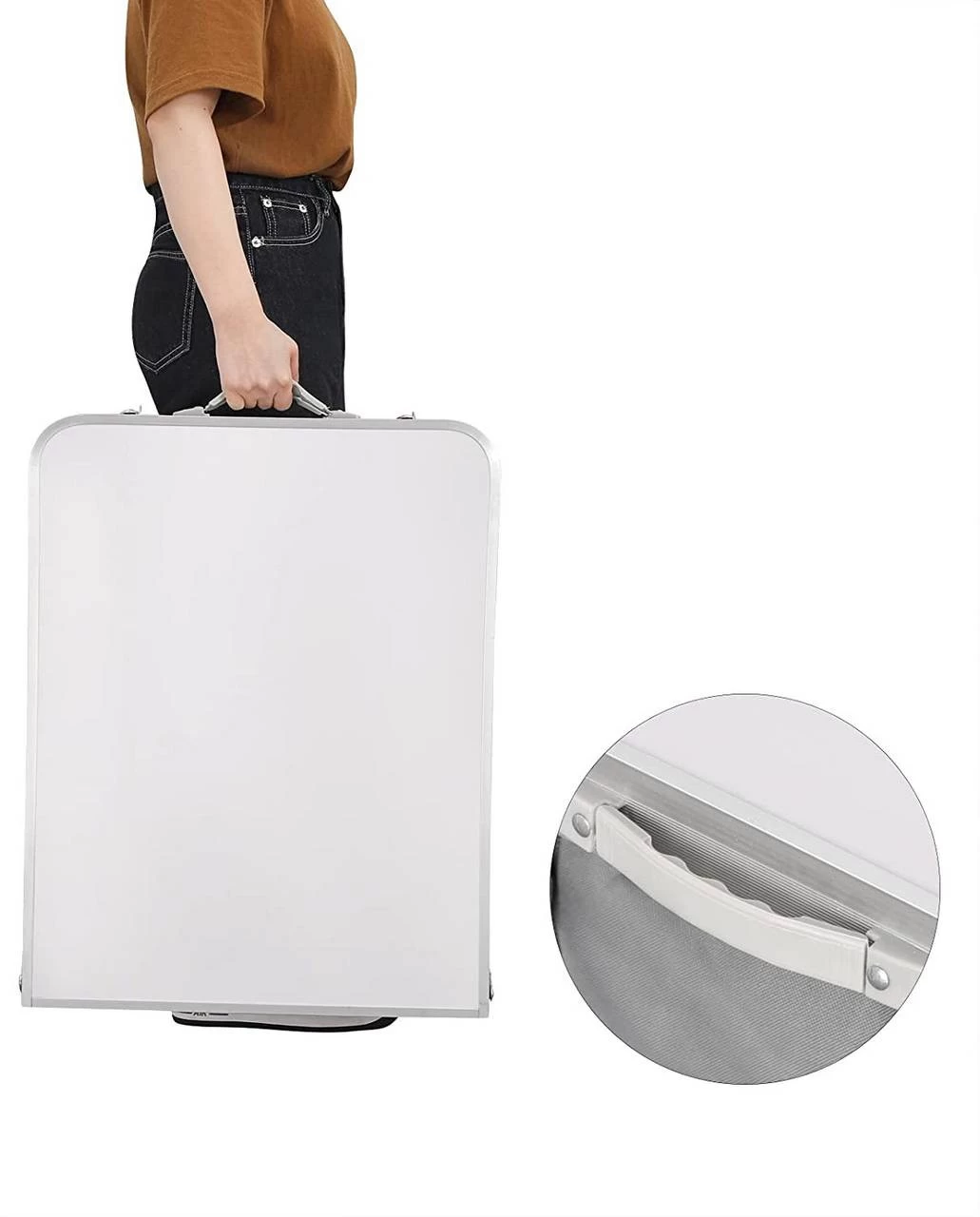Einfach zu transportieren und zu verstauen: Dieser silberne Campingtisch kann überall hin mitgenommen werden, da er nach dem Zusammenfalten nur 47 x 10 x 60 cm (B x H x L) einnimmt, wie ein Handgepäckkoffer. Dank seines geringen Volumens ist er leicht zu transportieren und passt sogar in jeden Kofferraum. Wenn er nicht gebraucht wird, kann er unter dem Bett oder hinter der Tür verstaut werden.