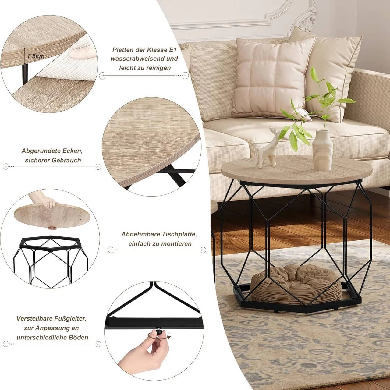 Einstellbare Fußpads: Der Sockel ist mit leicht verstellbaren Fußpads ausgestattet, um den Couchtisch stabiler zu machen und außerdem den Boden vor Kratzern zu schützen.