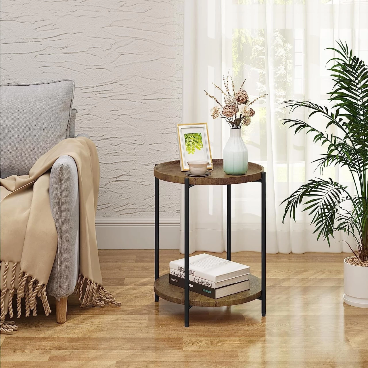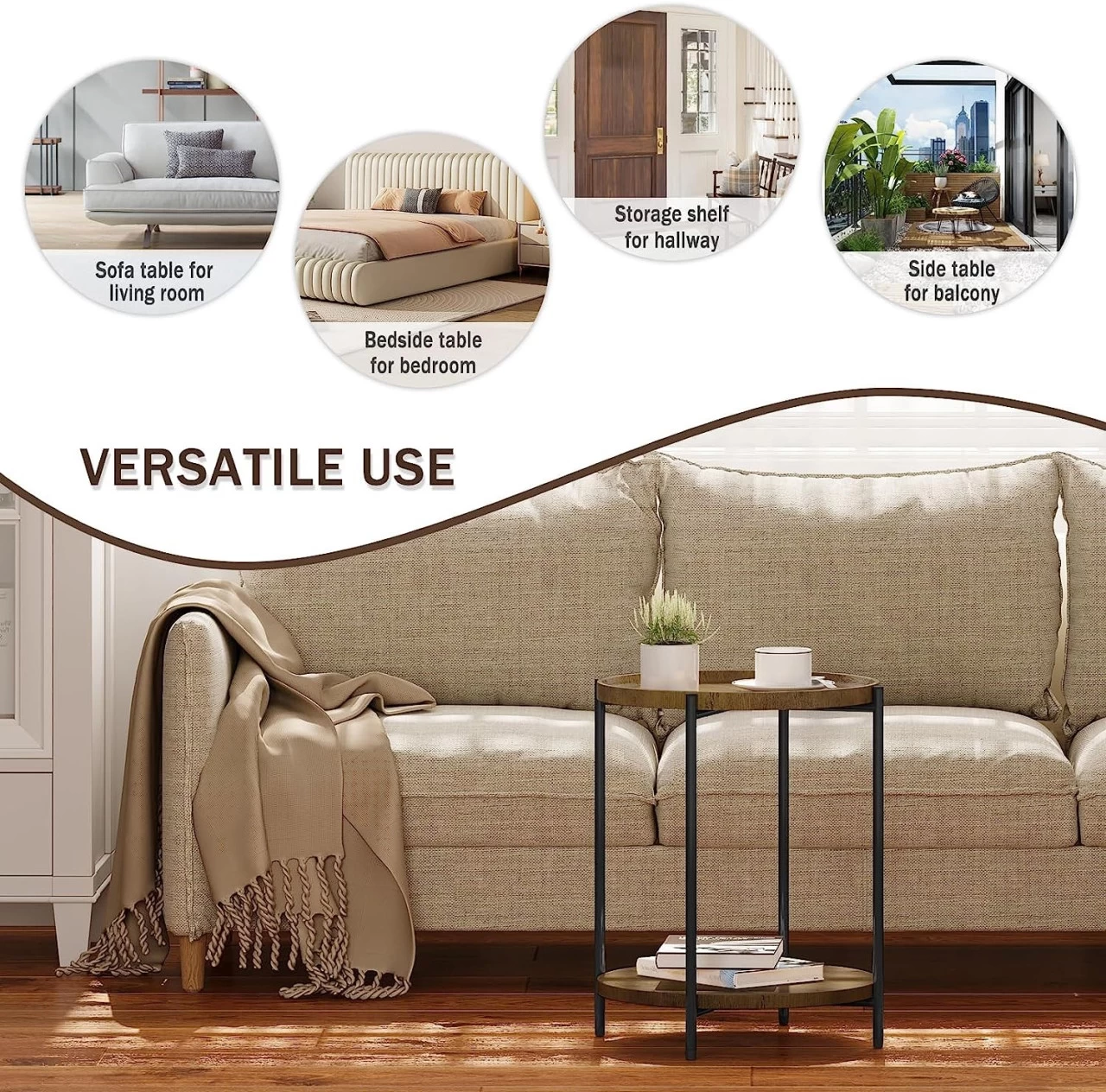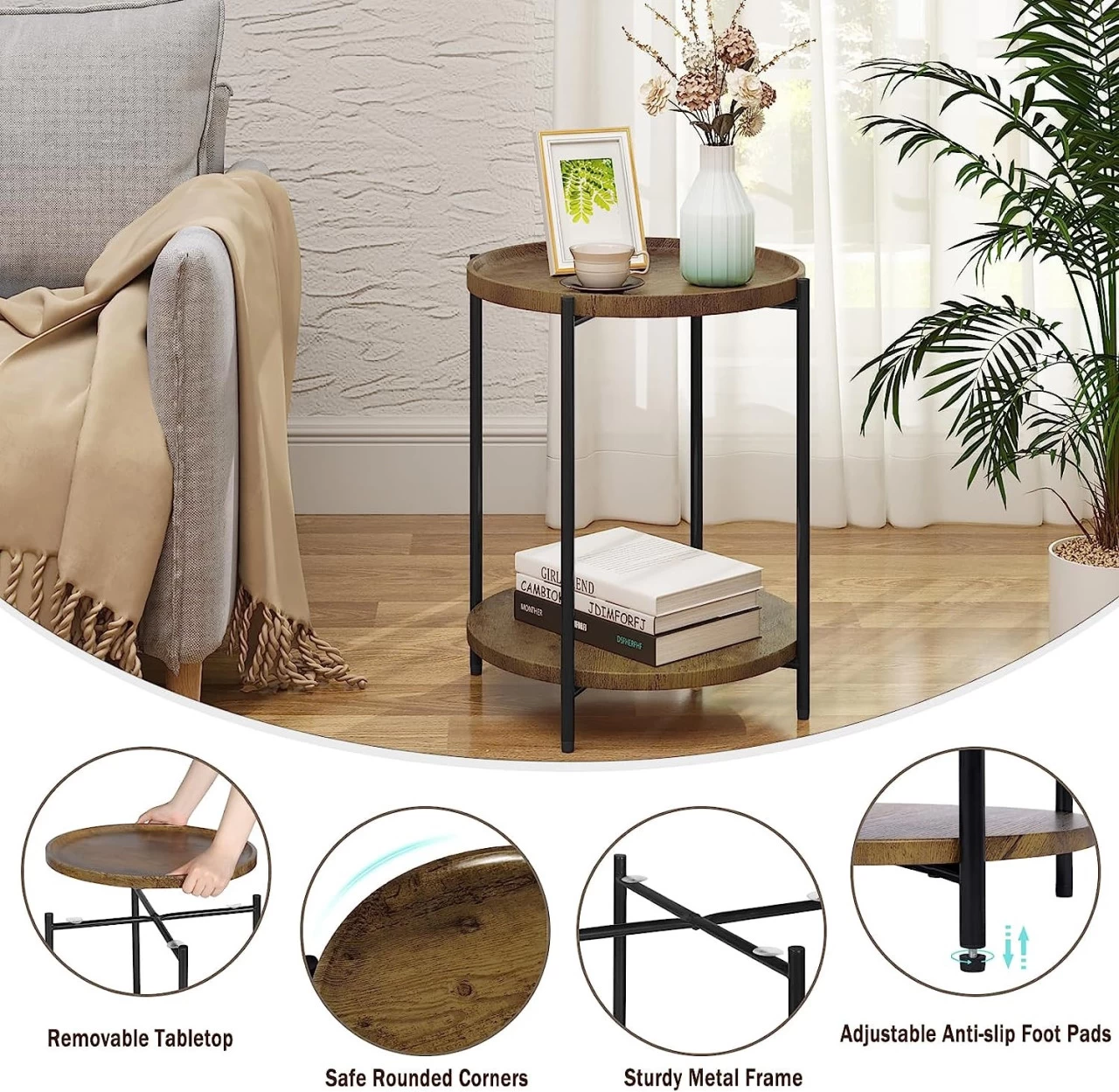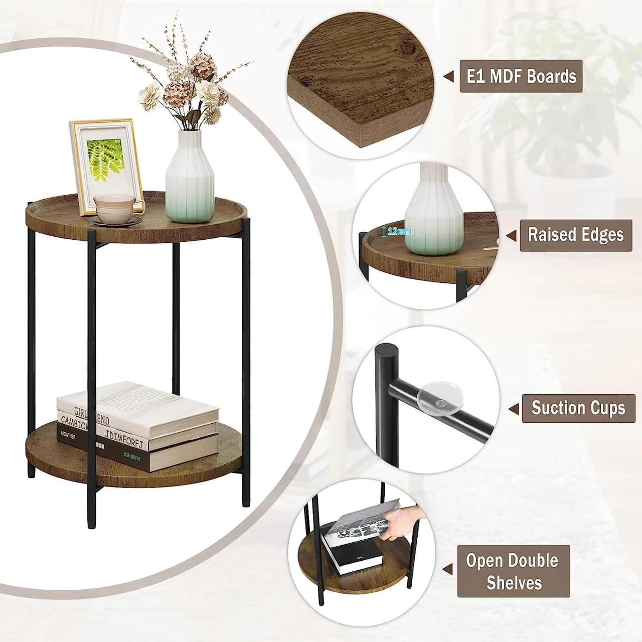- Sicher &Schön: Die rundenAblagen mit Vintage-Holzmaserung machen den Tisch natürlich, modern, die abgerundeten Ecken verletzen Sie nicht. Als eine Dekoration mit Ablagefunktion ist erideal als Kaffeetisch, Sofatisch, Telefontisch, Nachttisch usw.