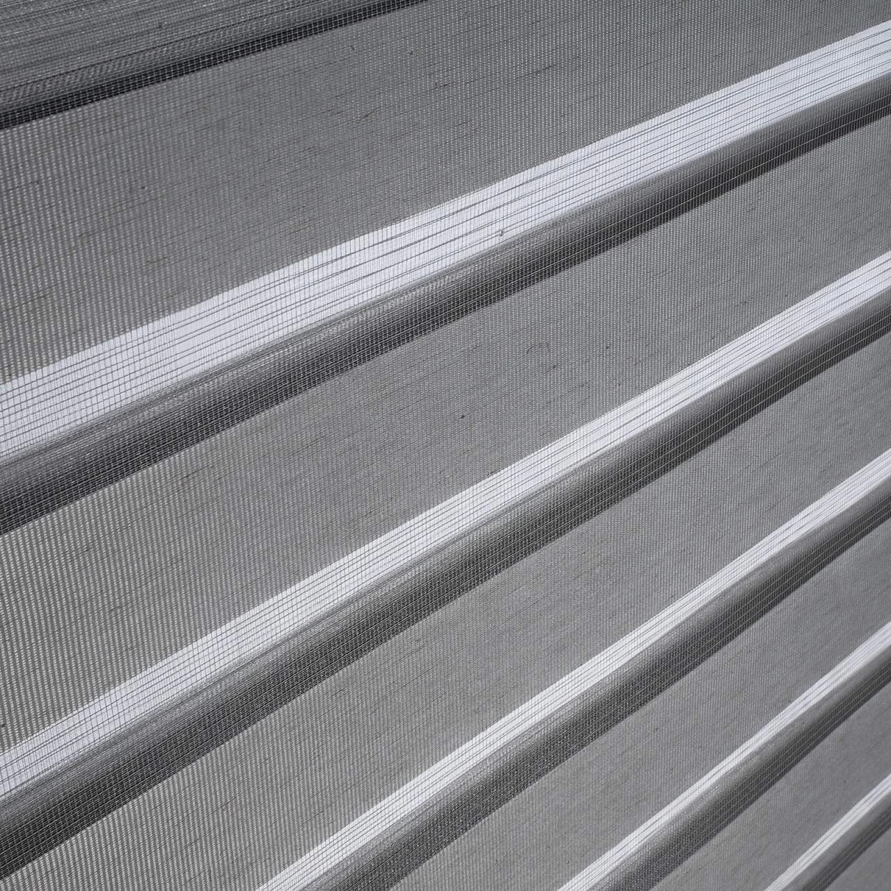 - Der Stoff ist abwechselnd in durchlässigen und undurchsichtigen Streifensegmenten gewebt und verluft doppelt gegeneinander.
