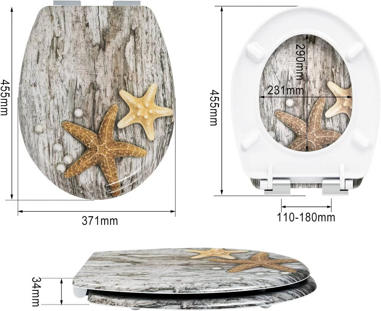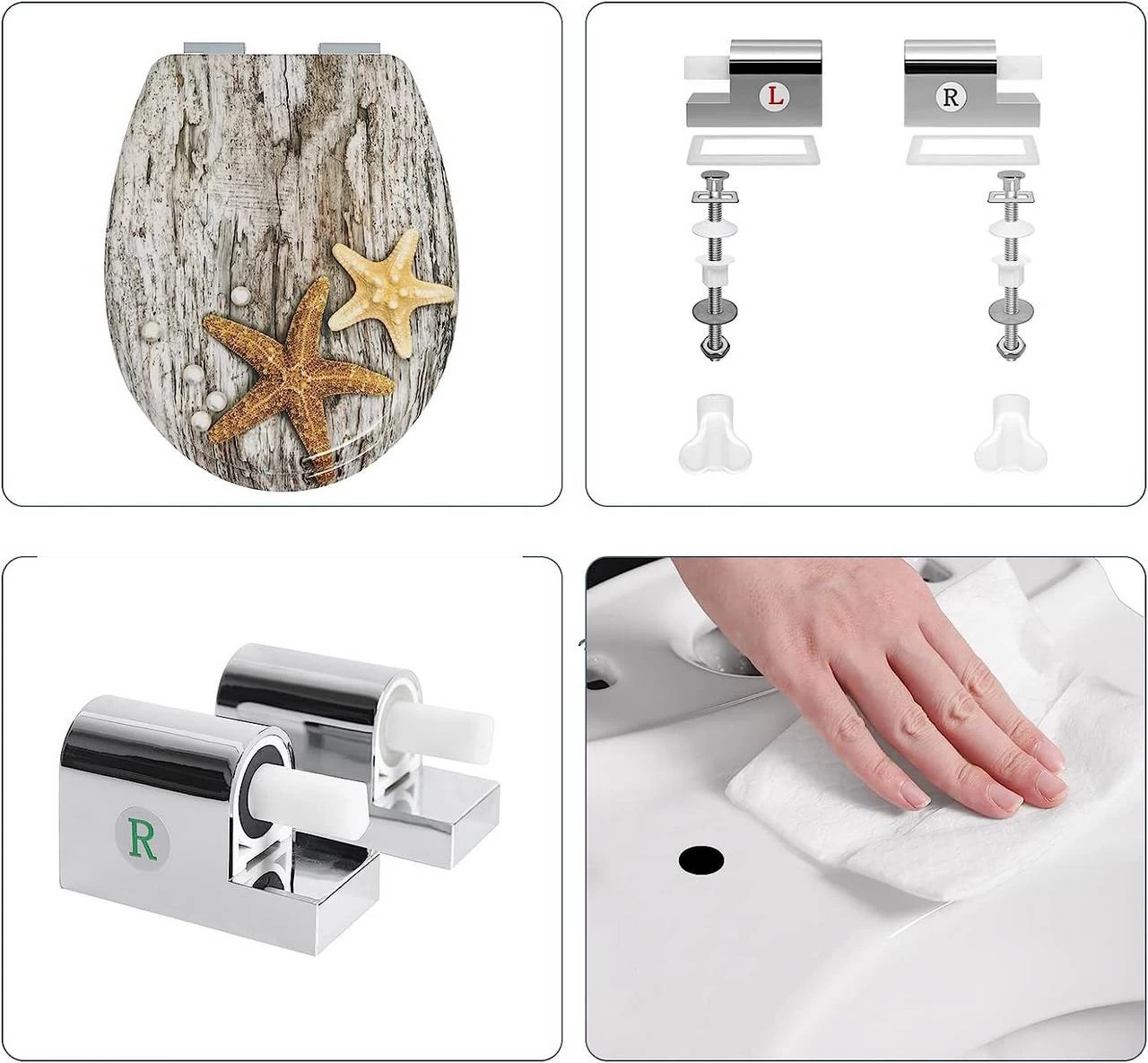 - Duroplastic Toilettendeckel: Der WC-Sitz ist aus Duroplast gefertigt. Seine Oberfläche ähnelt keramischen Glasuren, ist glatt, antibakteriell und leicht zu reinigen. Die Scharniere, die den Klodeckel und das WC verbinden, sind aus rostfreiem Stahl gefertigt, robust und langlebig. Darüber hinaus hat der Sitz aufgrund seiner Bedruckung ein schönes und modisches Aussehen und ist eine gute Dekoration für Ihr Badez