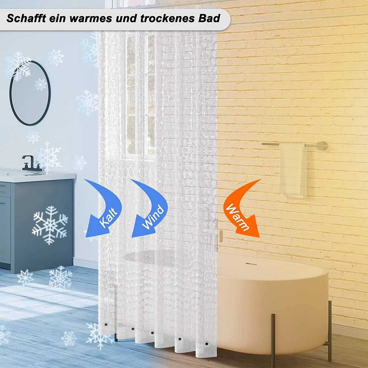 Warme Badumgebung: Der Duschvorhang aus EVA kann die kalte Luft abschirmen, um Ihnen vor Kälte zu schützen und einen warmen und gemütlichen Raum zu schaffen. Außerdem ist das Material hitzebeständig. Auch bei warmer Umgebung verformt sich der Badvorhang nicht.