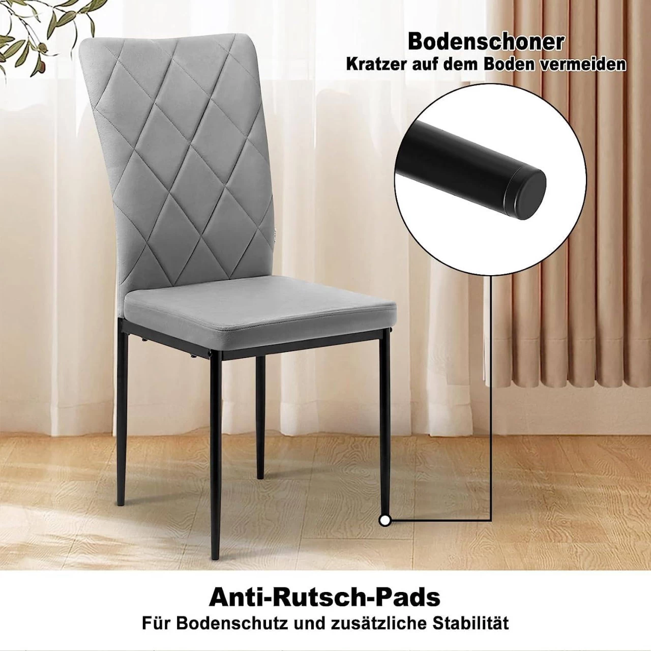 Bodenschonend: Die Beine sind mit rutschfesten Pads ausgestattet, um den Boden zu schützen und die Geräusche beim Bewegen des Stuhls zu reduzieren.