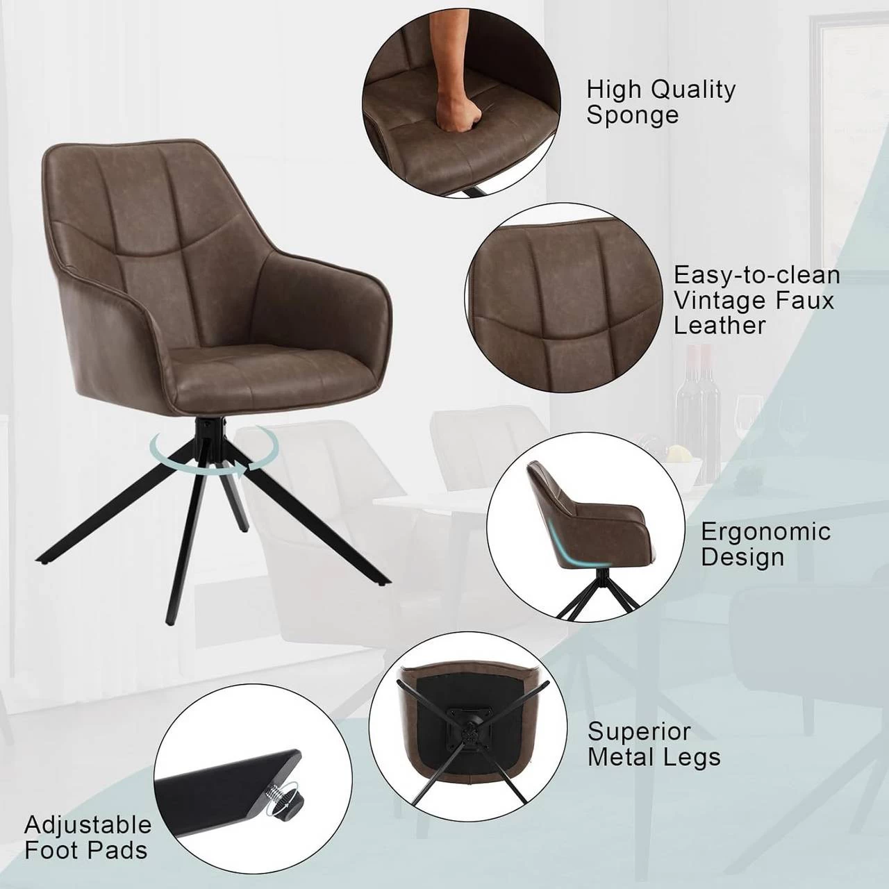 - 360° DREHBAR: Der drehbare Esszimmerstuhl hat eine Drehplatte unter dem Sitz, die es Ihnen ermöglicht,sich in jede beliebige Richtung zu drehen, um etwas zu greifen. Sie können sich auch entspannt und sanft drehen und die moderne Atmosphäre genießen