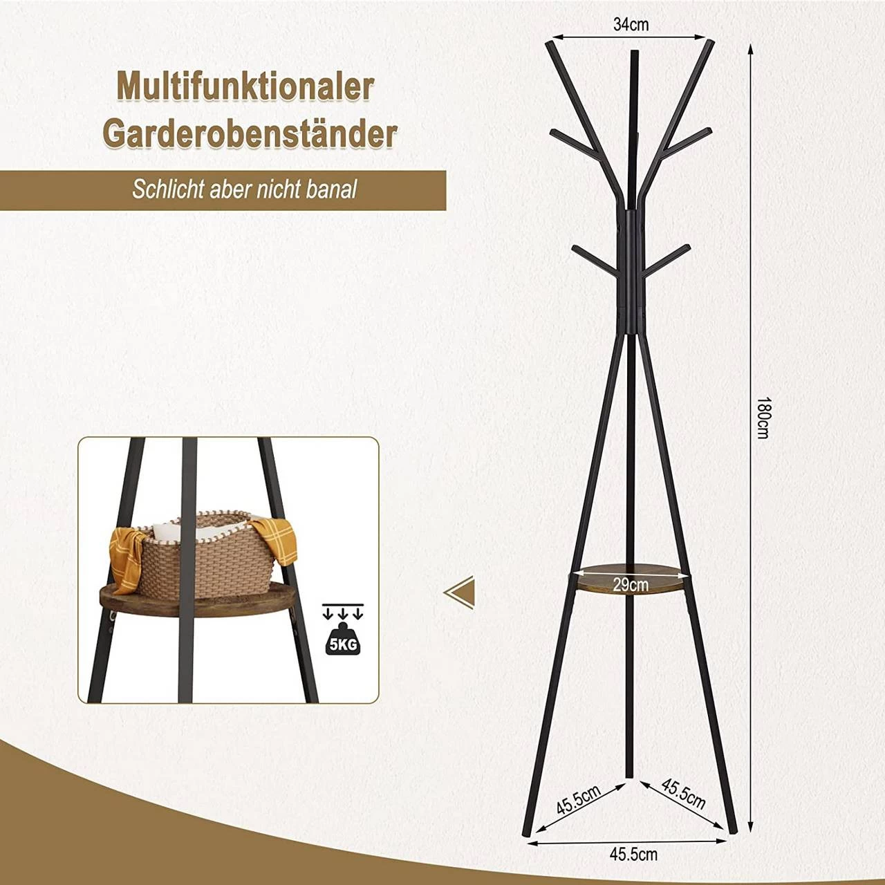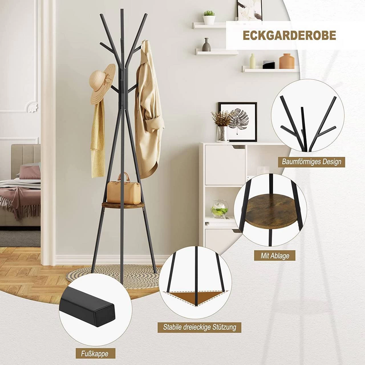 - HOHE STABILITÄT: Sowohl die Haken als auch die Beine dieses dreibeinigen Garderobenständers weisen eine radiale Dreiecksform mit einem Winkel von 120° auf. Die untere Ablage sorgt für zusätzlichen Stauraum und erhöht die Stabilität