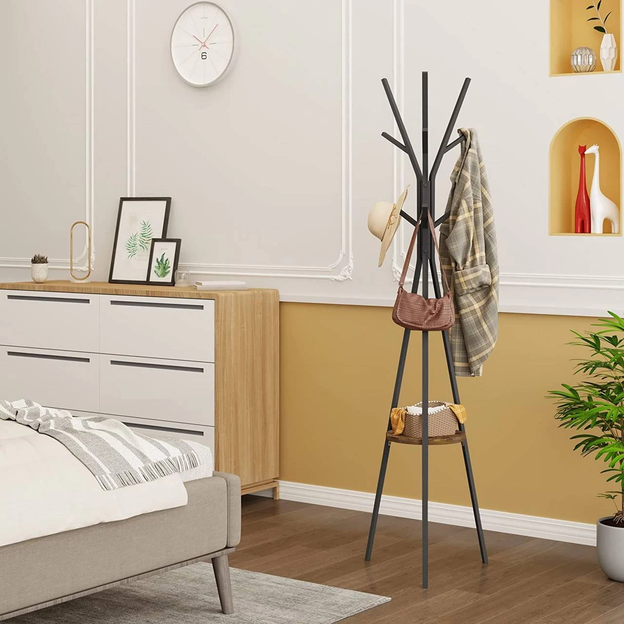 - GUTE AUFRÄUMHILFE: Dieser Garderobenständer in Baumform hat 9 astförmige Haken und 1 runde Ablage und kann eine Oase für Ihre täglichen Gegenstände wie Mäntel, Jacken, Hüte, Schals, Handtaschen, Aufbewahrungskörbe, Topfpflanzen usw. bieten
