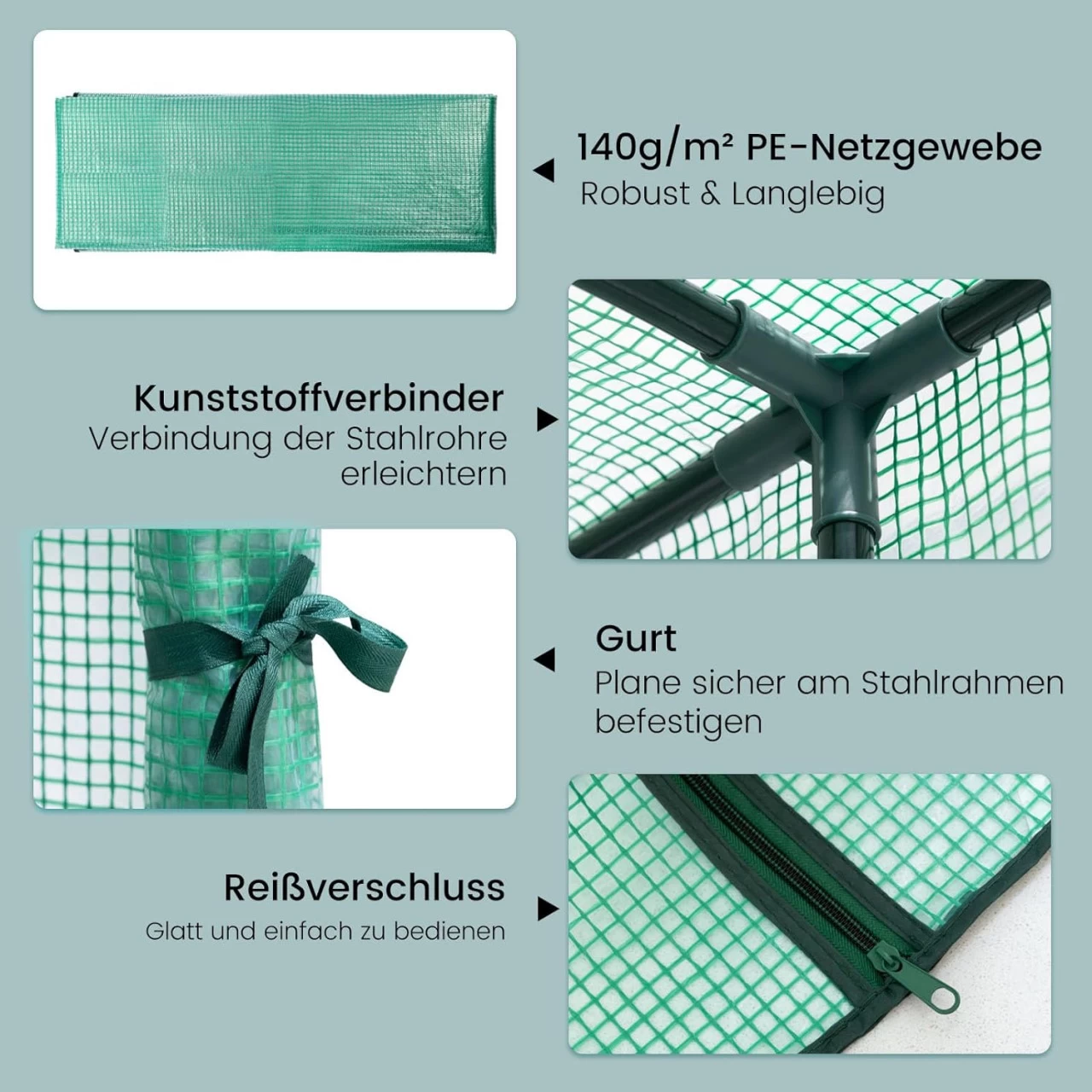 - HOCHWERTIGE QUALITÄT: Die 140 g/m2 PE-Folie ist stark, wasserdicht, korrosions- und UV-beständig und reißfest. Dank des Gitters ist die Plane des Tomatenhauses haltbarer und schützt Pflanzen vor Unwetter, Insekten, Vögeln usw