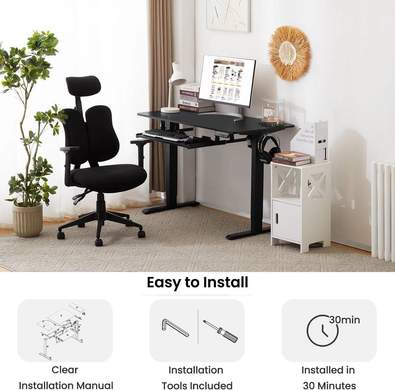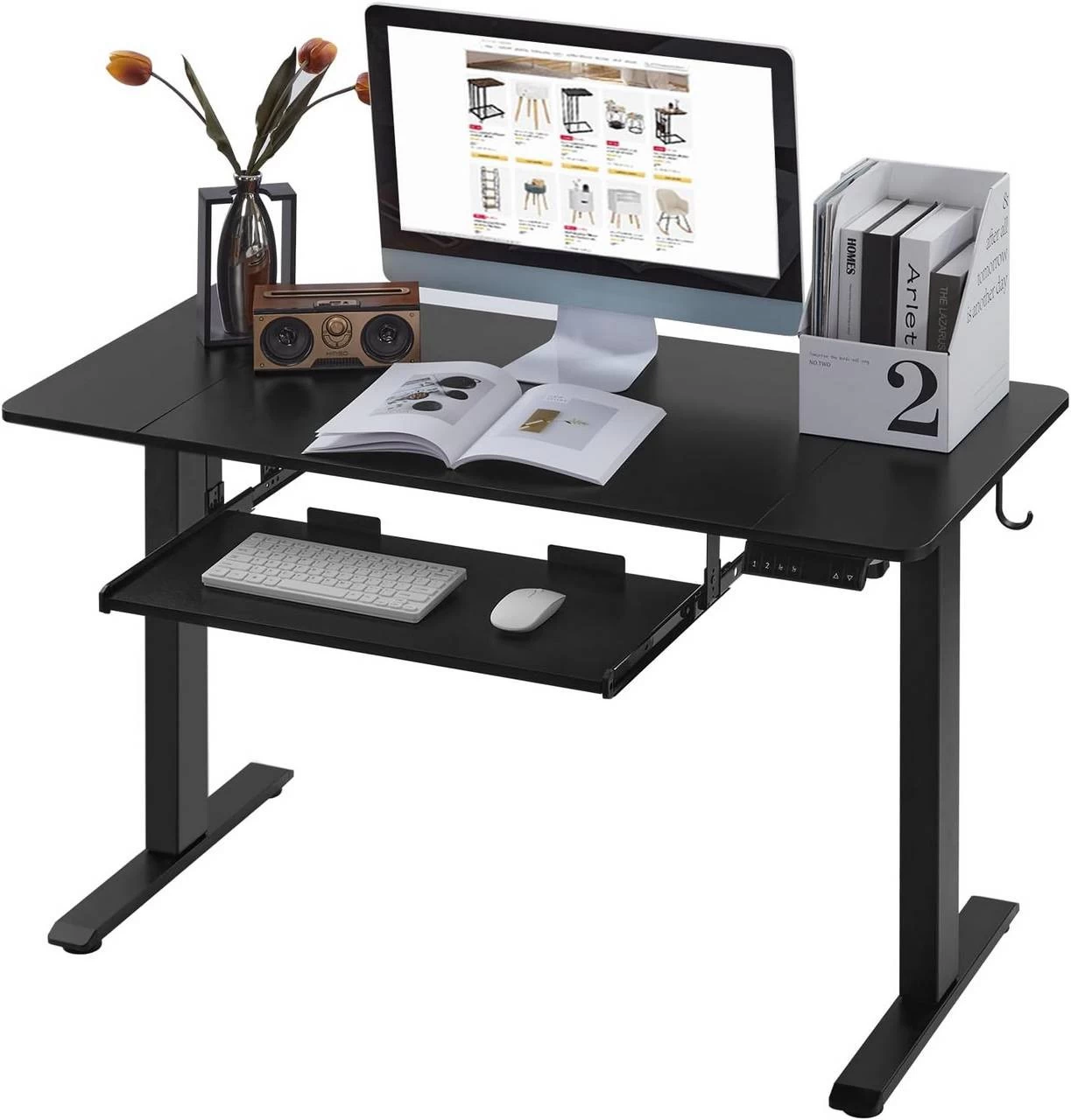 - DURCHDACHTES DESIGN: Der höhenverstellbare Tisch verfügt über eine geräumige Tischplatte (140×60 cm), eine ausziehbare Tastaturablage und zwei Haken für Kopfhörer oder Taschen, um den Tisch für bequemes und effizientes Arbeiten aufgeräumt zu halten