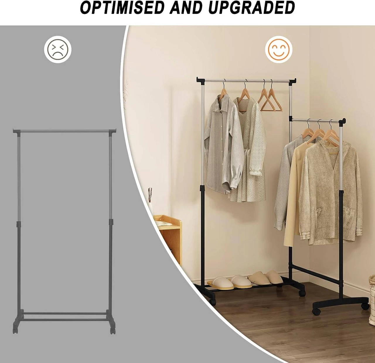 - LANGLEBIGE ROLLGARDEROBE: Aus robusten Metallrohren bestehend und durch hochwertige Kunststoffstücke verbunden, ist diese Garderobe sehr stabil. Sie kann bis zu 35 kg tragen (jede Kleiderstange: 15 kg, die Schuhablage: 6 kg)