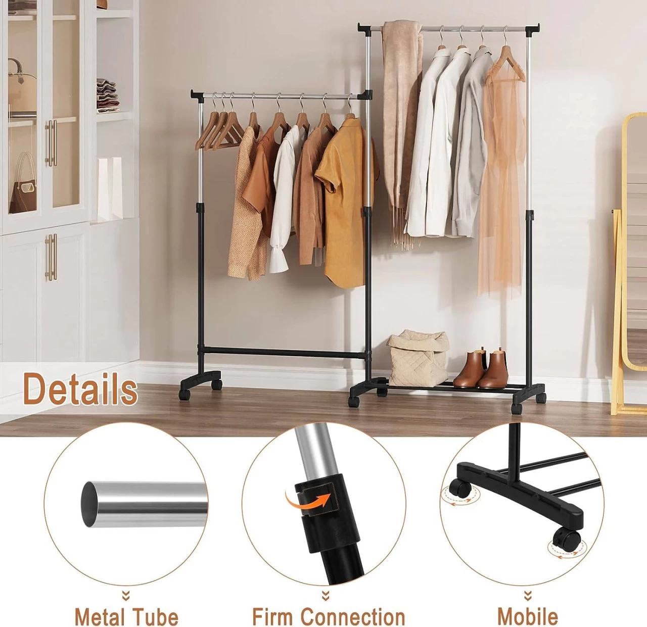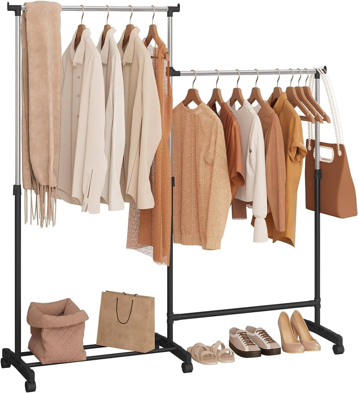 Untere Ablage: Die beiden Stangen an der Unterseite verleihen dem mobilen Kleiderständer zusätzliche Stabilität und bieten Platz für Schuhe und Aufbewahrungsboxen.