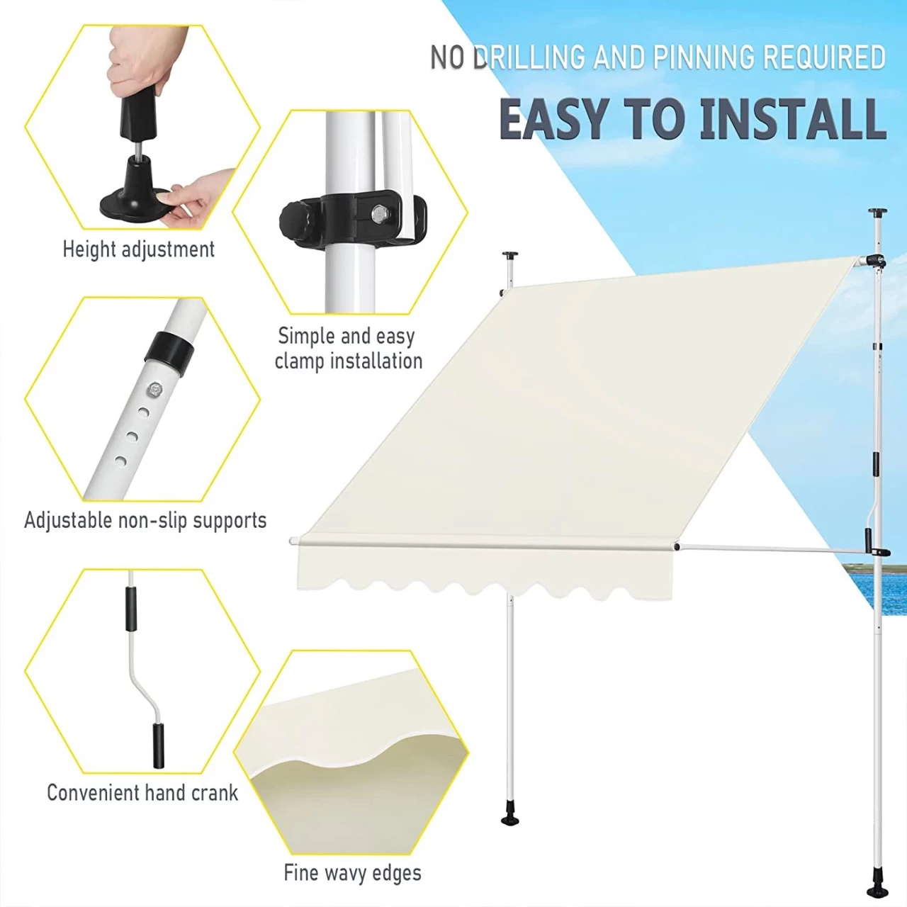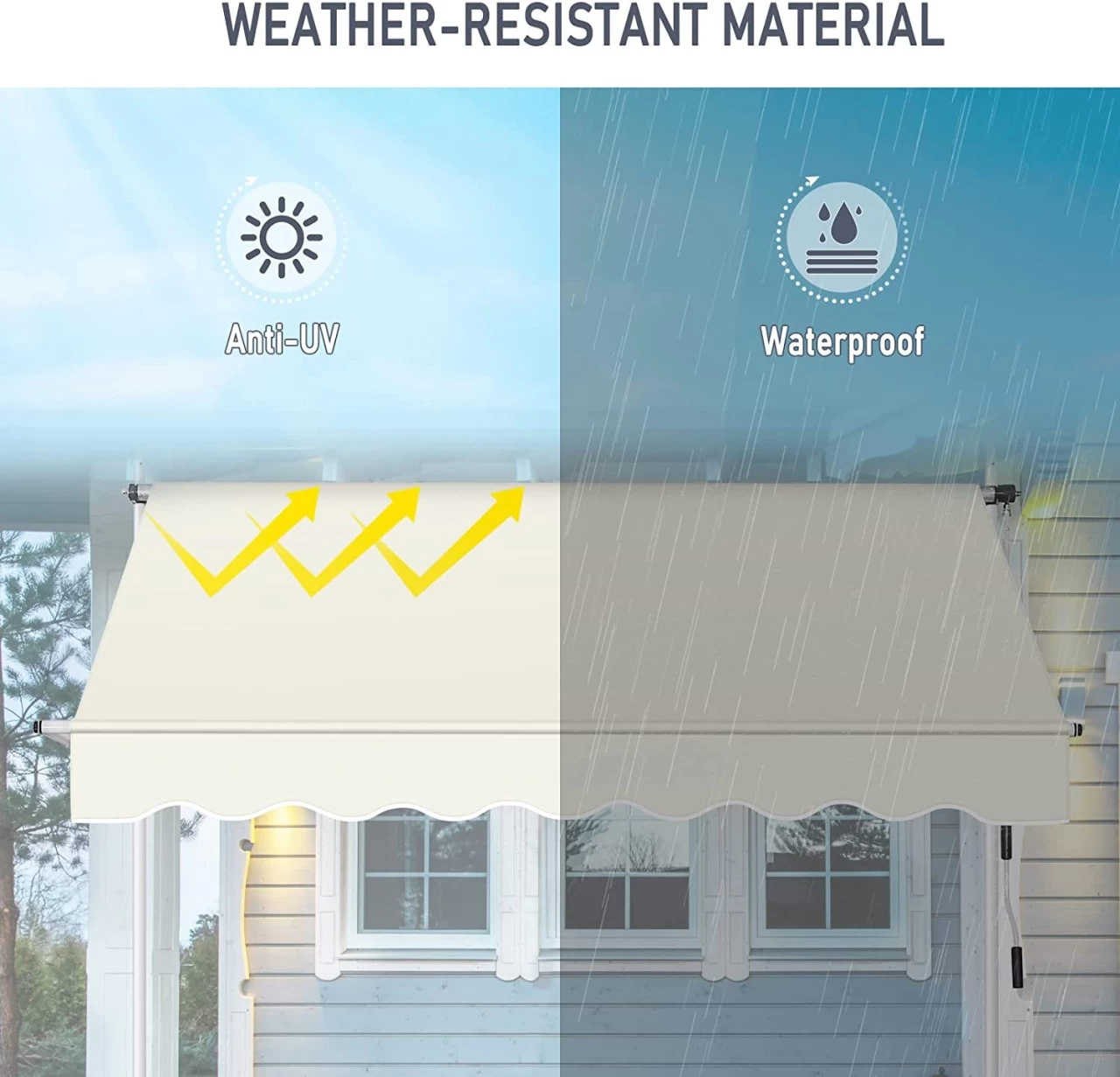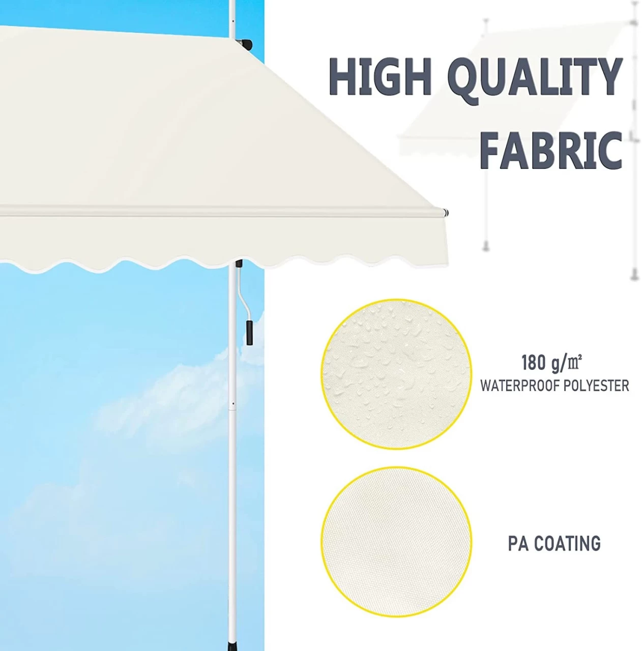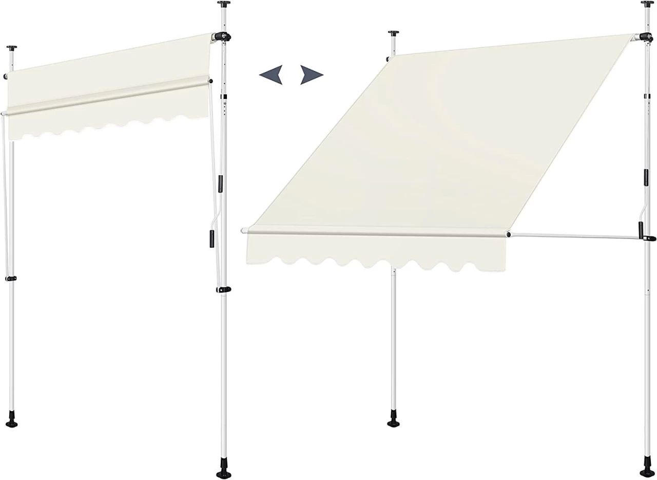 - Hochwertige Materialien: Das Markisentuch besteht aus hochwertigem, dick gewebtem 180 g/m² Polyester, ist schmutz-, wasser- und staubabweisend und lässt sich leicht mit einem feuchten Tuch abwischen. Der langlebige und robuste Metallrahmen sorgt für einen festen und stabilen Halt und eine lange Lebensdauer