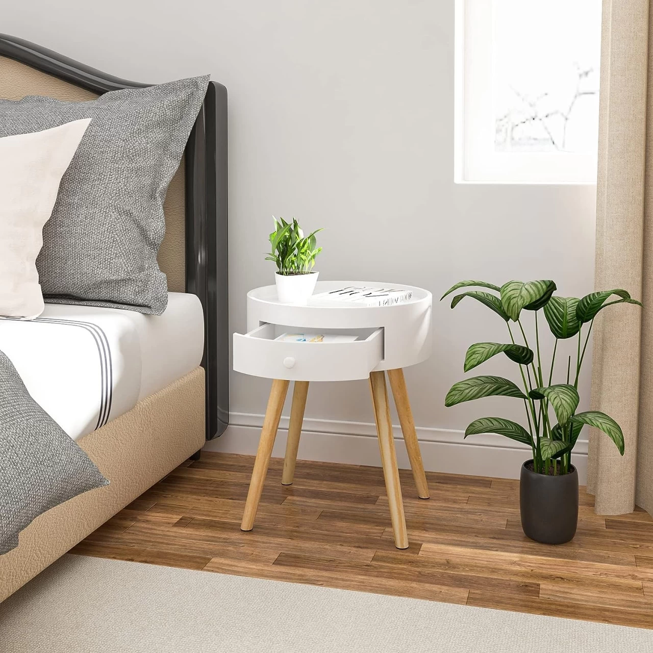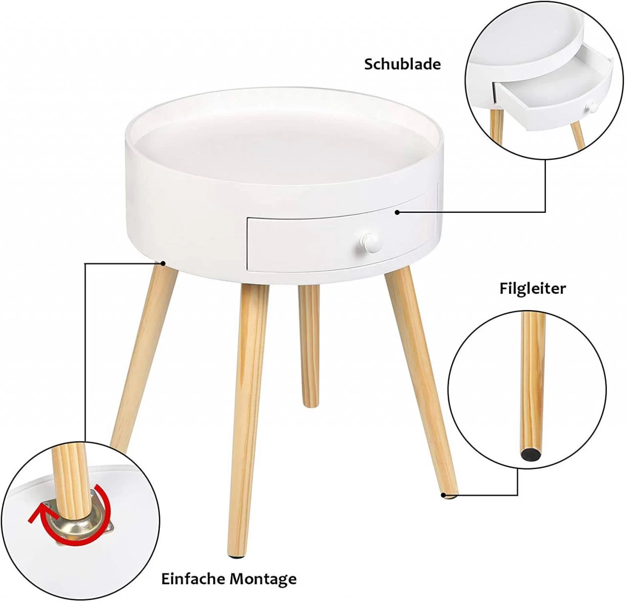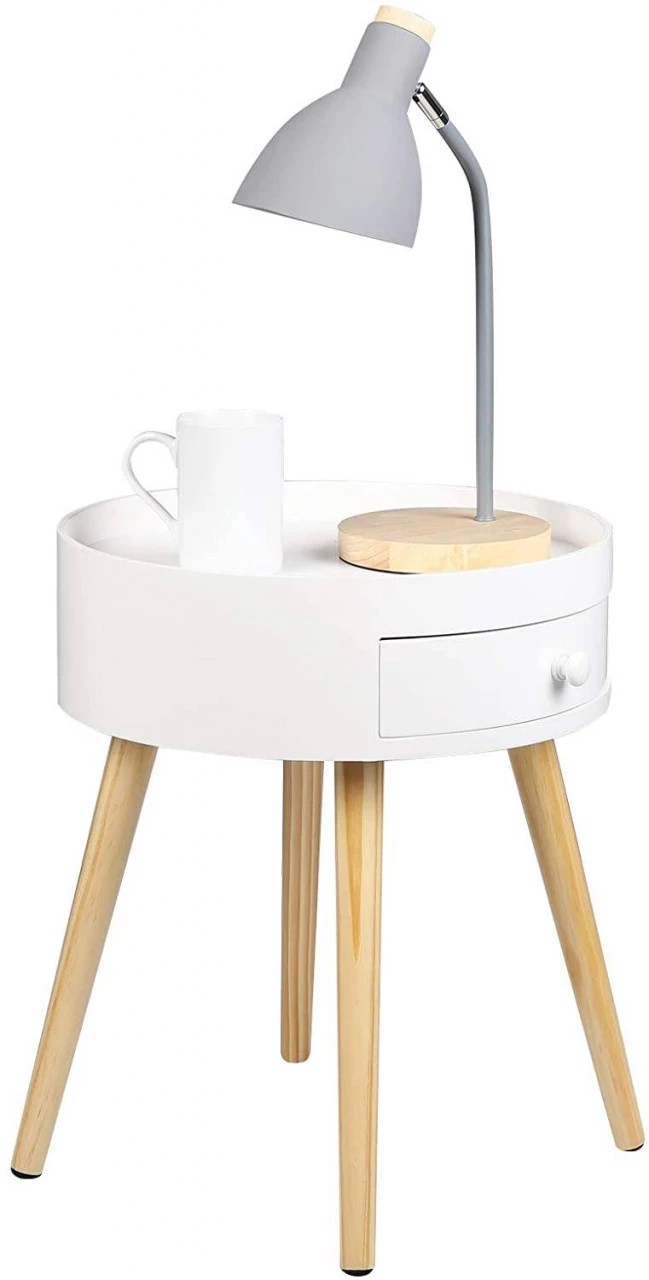 - Ausreichend Stauraum: Auf der runden Tischplatte können Sie Lampe, Wecker oder Tasse stellen. In der Schublade können Sie Kleinigkeiten wie Schlüssel, Fernbedienungen, Ladegeräte ordentlich unterbringen. Ein moderner und praktischer Beistelltisch