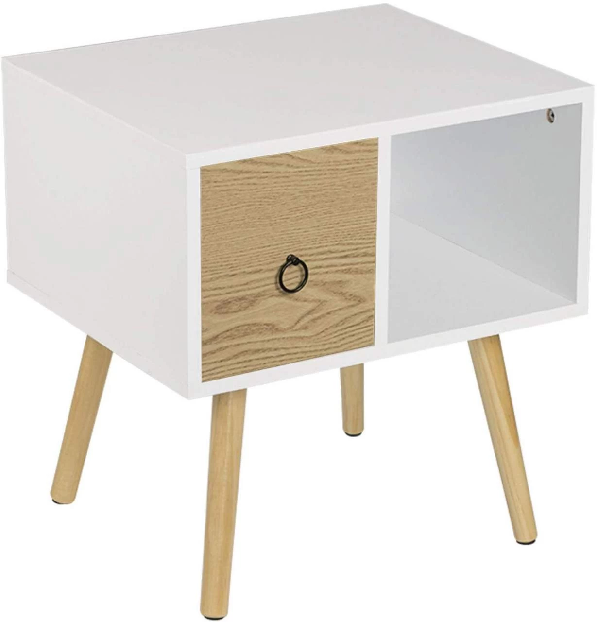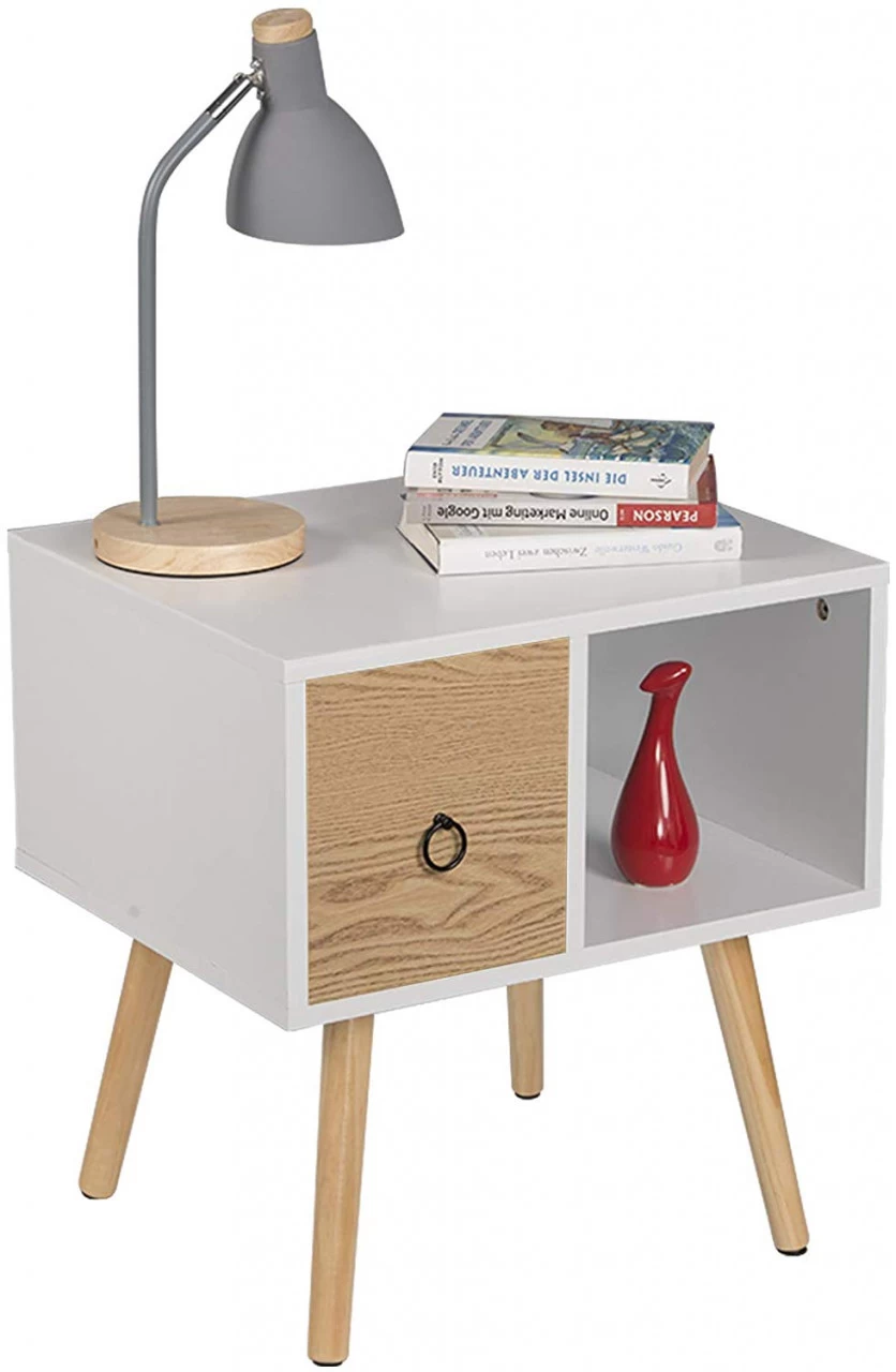 - Rationale Aufbewahrung mit Trennwänden Auf dem Nachttisch können Sie Tischlampe, Handy, Tassen und andere tägliche Dinge abstellen. Die linke Schublade kann zur Aufbewahrung von kleiner Dinge wie Fernbedienung, Armbanduhr, Schlüssel usw. verwendet werden und das offene rechte Regal kann zum Verstauen von Zeitschriften, Büchern usw. verwahrt werden. Die rationale Aufbewahrung mit Trennwänden macht Ihr Zimmer aufgeräumter und bequemer, um Gegenstände auf dem Nachttisch griffbereit zu haben