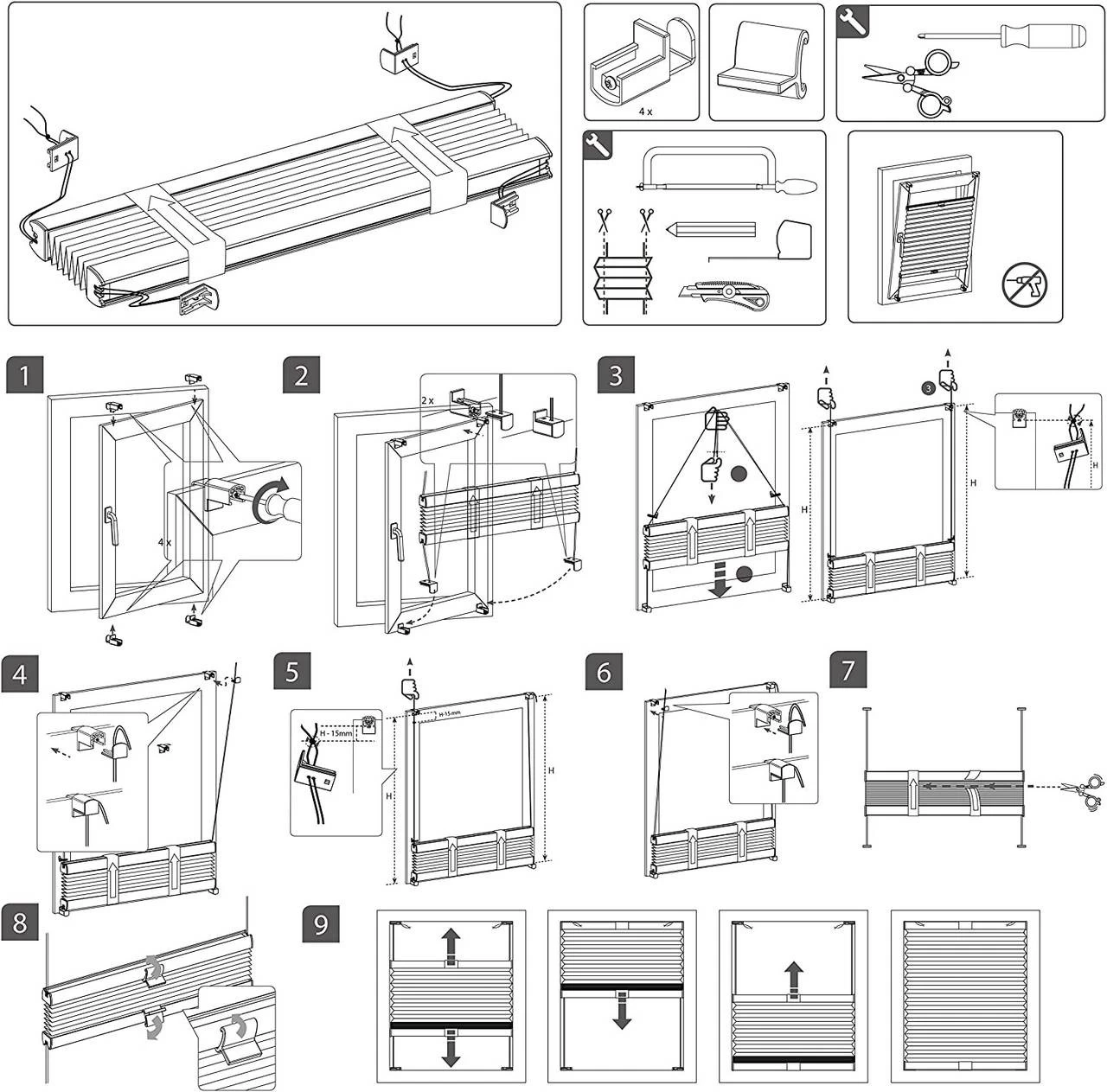 - HINWEISE: Die empfohlene Breite des Plissees entspricht der Breite der Glasscheibe zuzüglich 4 cm. Beispiel: Wenn die Scheibe 46 cm breit ist, empfehlen wir Ihnen ein 50 cm breites Faltrollo. Bei Ausmessen sollten die Griffe oder andere hervorstehende Beschläge auf beiden Seiten des Fensters nicht überschritten werden und die Höhe darf nicht geringer sein als die Höhe des Fensters
