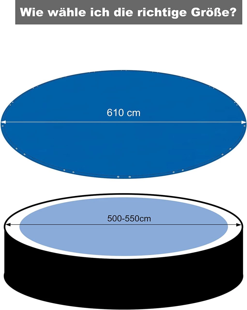 - Mehrere Größenoptionen: Verfügbare Durchmesser: 305/360/420/460/560/610 cm. Damit die Abdeckung perfekt zum Schwimmbecken passt, wird sie ca. 40-60 cm größer im Durchmesser gefertigt, z.B. ist die Abdeckung mit einem Durchmesser von 360 cm für Pools mit einem Durchmesser von 300-320 cm geeignet. Bevor Sie sich für eine Abdeckplane entscheiden, vergleichen Sie bitte deren Größe mit der Ihres Pools, um sicherzustellen, dass sie passt