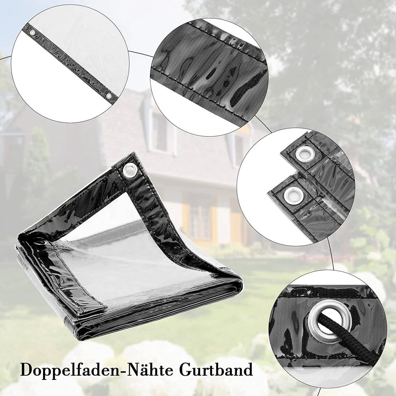 - Die vier 5 cm breiten Seiten der wasserdichten und transparenten Plane sind aus den Doppelnähten gefertigt, die Plane ist langlebig und reißfest. Der Rand der Plane ist alle 50 cm mit rostfreien Aluminiumlöchern ausgestattet, die stabilen Ösen verleihen der wasserdichten Kunststoffplane Haltbarkeit und feste Stabilität.