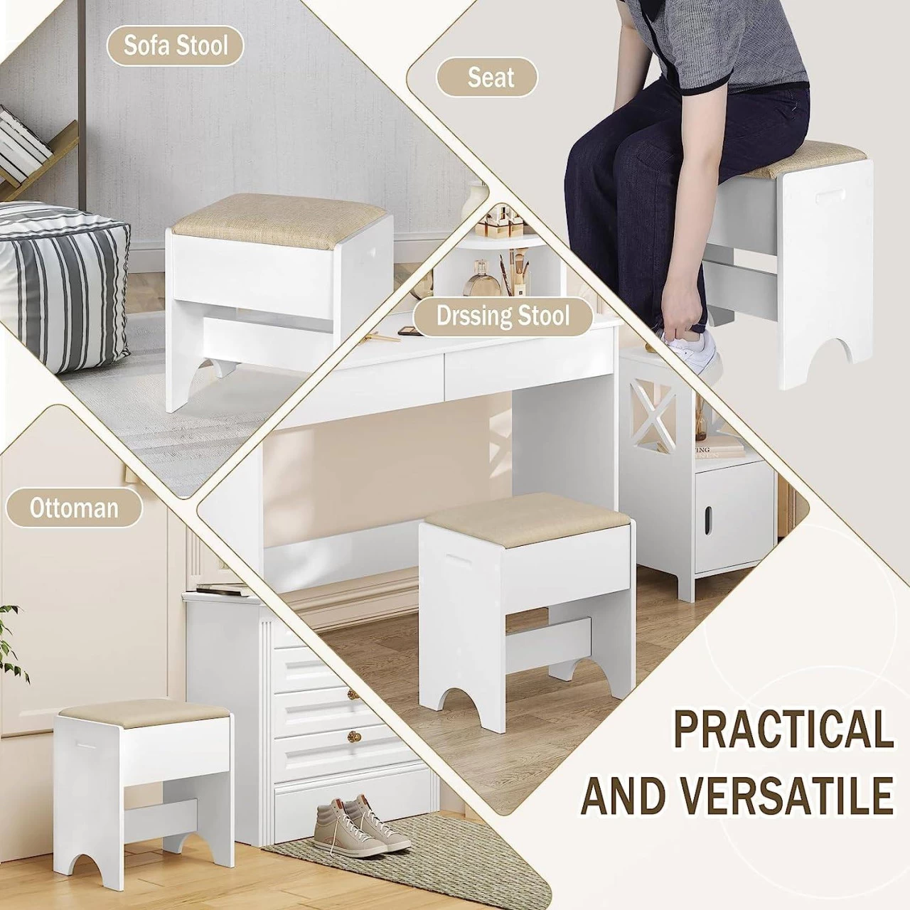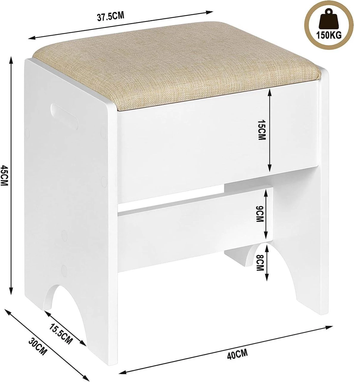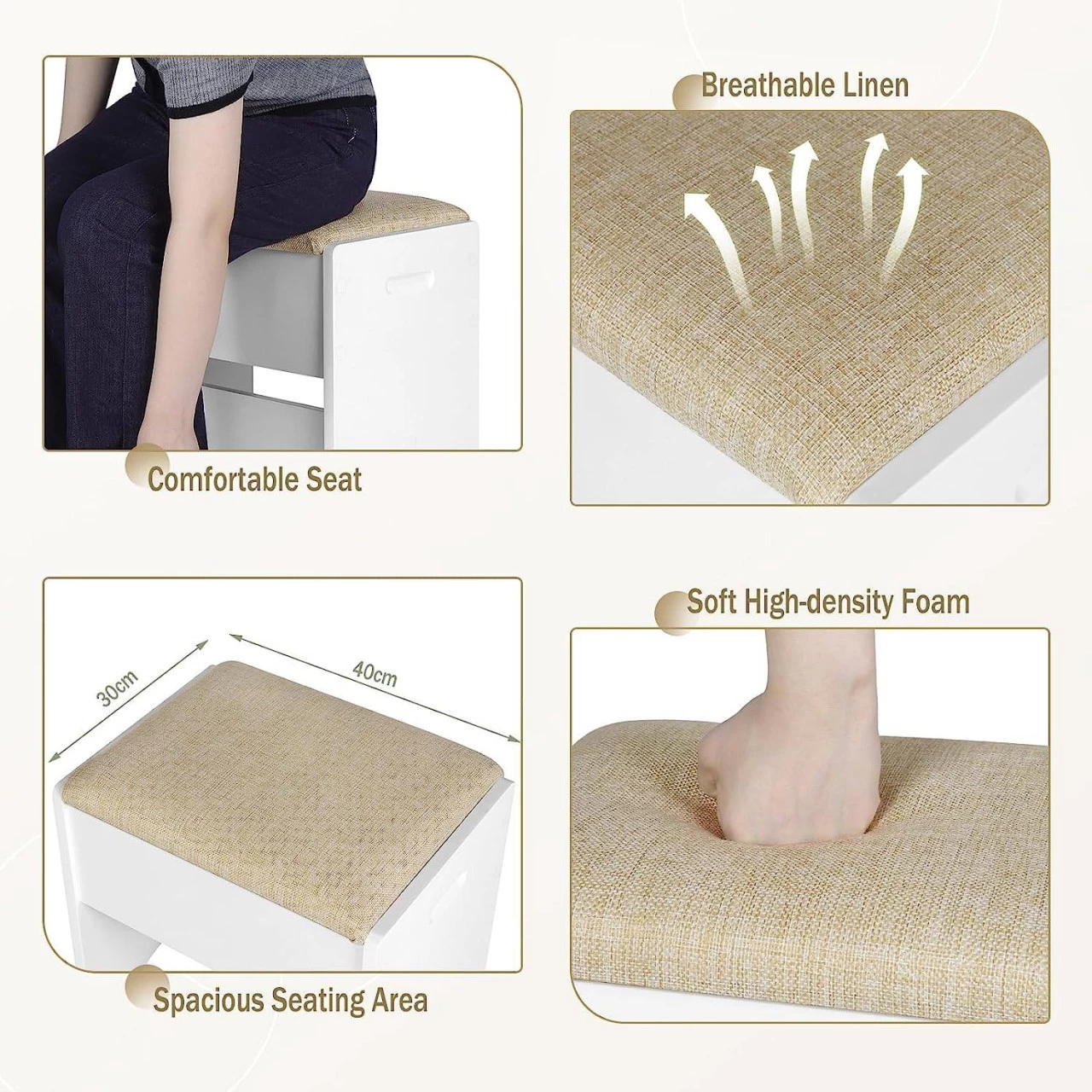 - KOMFORTABLER SITZ: Der Schminkhocker verfügt über eine 40×30 cm große, gepolsterte Sitzfläche, die mit einem atmungsaktiven Leinenbezug für ein weiches und bequemes Sitzerlebnis und zusätzlichen Genuss beim Ankleiden sorgt