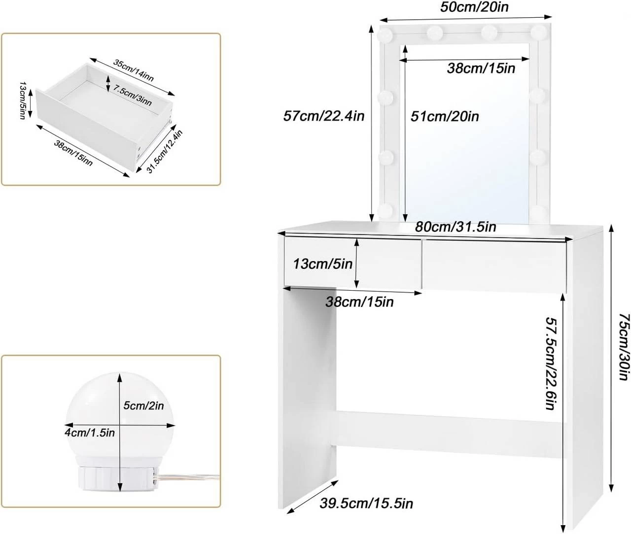 - GROSSER STAURAUM: Mit einer großen Tischplatte von 80×39.5 cm und 2 Schubladen hilft Ihnen dieser Schminktisch mit Spiegel, Ihre Pflege- und Schönheitsprodukte, Parfums und Accessoires sowie Ihren Schmuck zu organisieren und mehr Ordnung zu schaffen