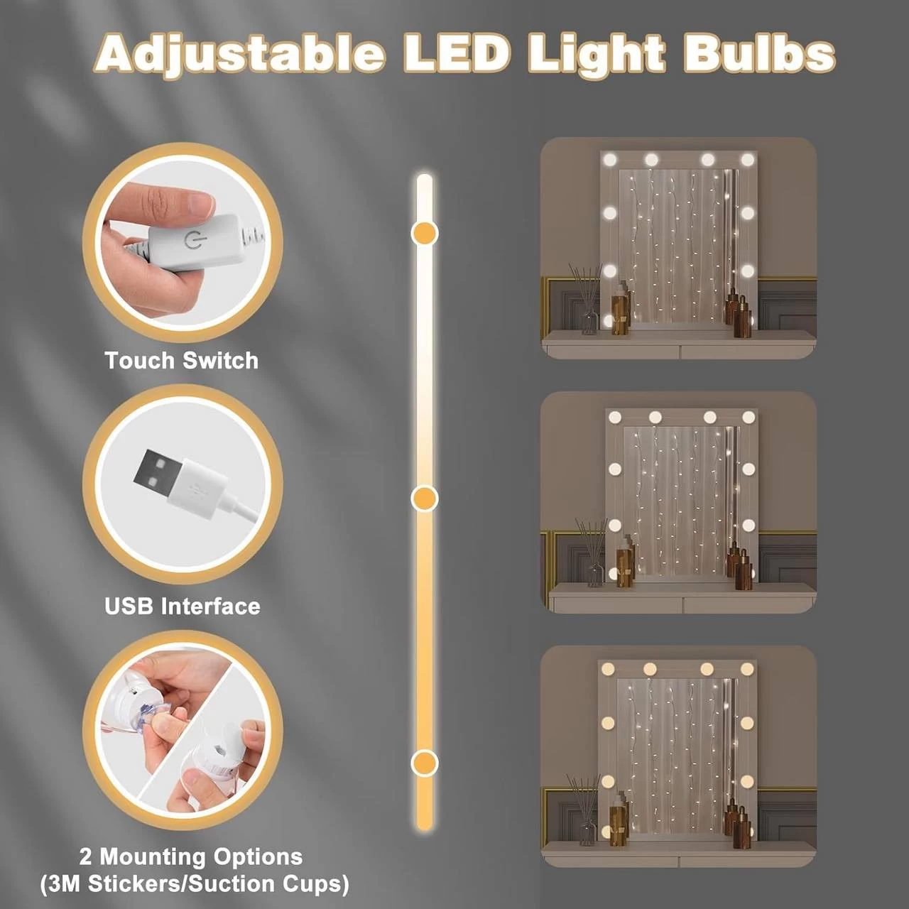 - EINSTELLBARES LED-LICHT: Der Schminktisch ist mit einem scharfen Spiegel und 10 LED-Glühbirnen mit einem USB-Stecker und 3 Beleuchtungsmodi ausgestattet, damit Sie sich bei sanftem und passendem Licht auftragen und Ihre Haut pflegen können