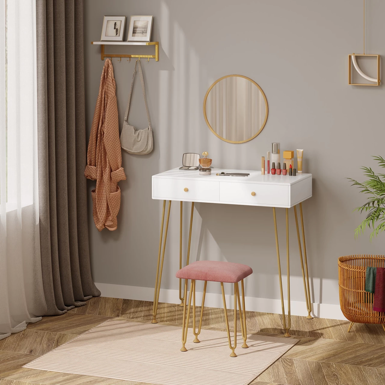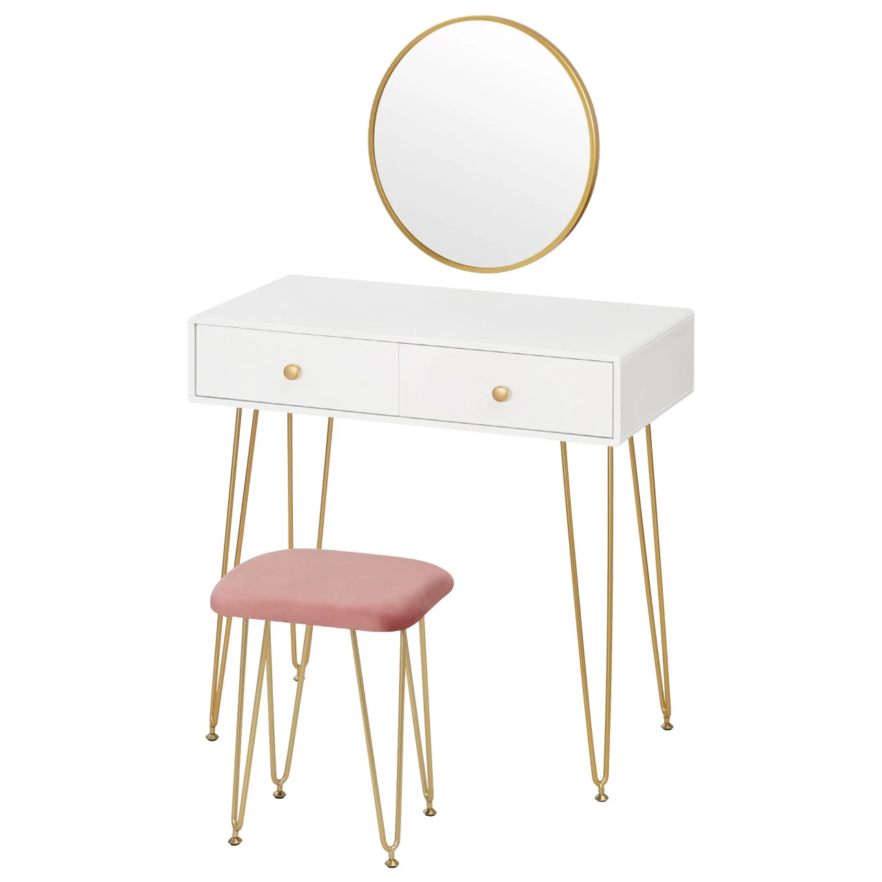 - Design für Aussehen: Die Beine des Tisches und Hockers sind golden und haben grazilen Bogen. Vor dem Hintergrund der Beine wirkt der weiße Schminktisch auffälliger.