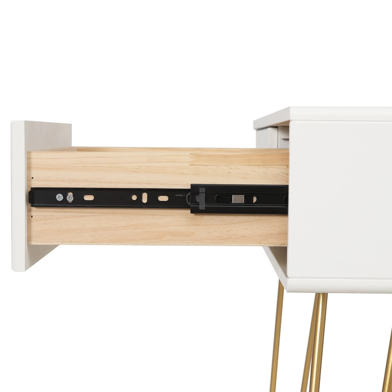 - Design für Detail: Unter jedem Bein befindet sich ein kleiner Bodenschoner, der den Boden vor Kratzern schützt. Um unnötige Verletzung zu vermeiden, lassen wir die Tischkante gebogen sein. Unter der Schublade ist die Führungsschiene installiert, so dass die Schubladen leicht gezogen werden können.