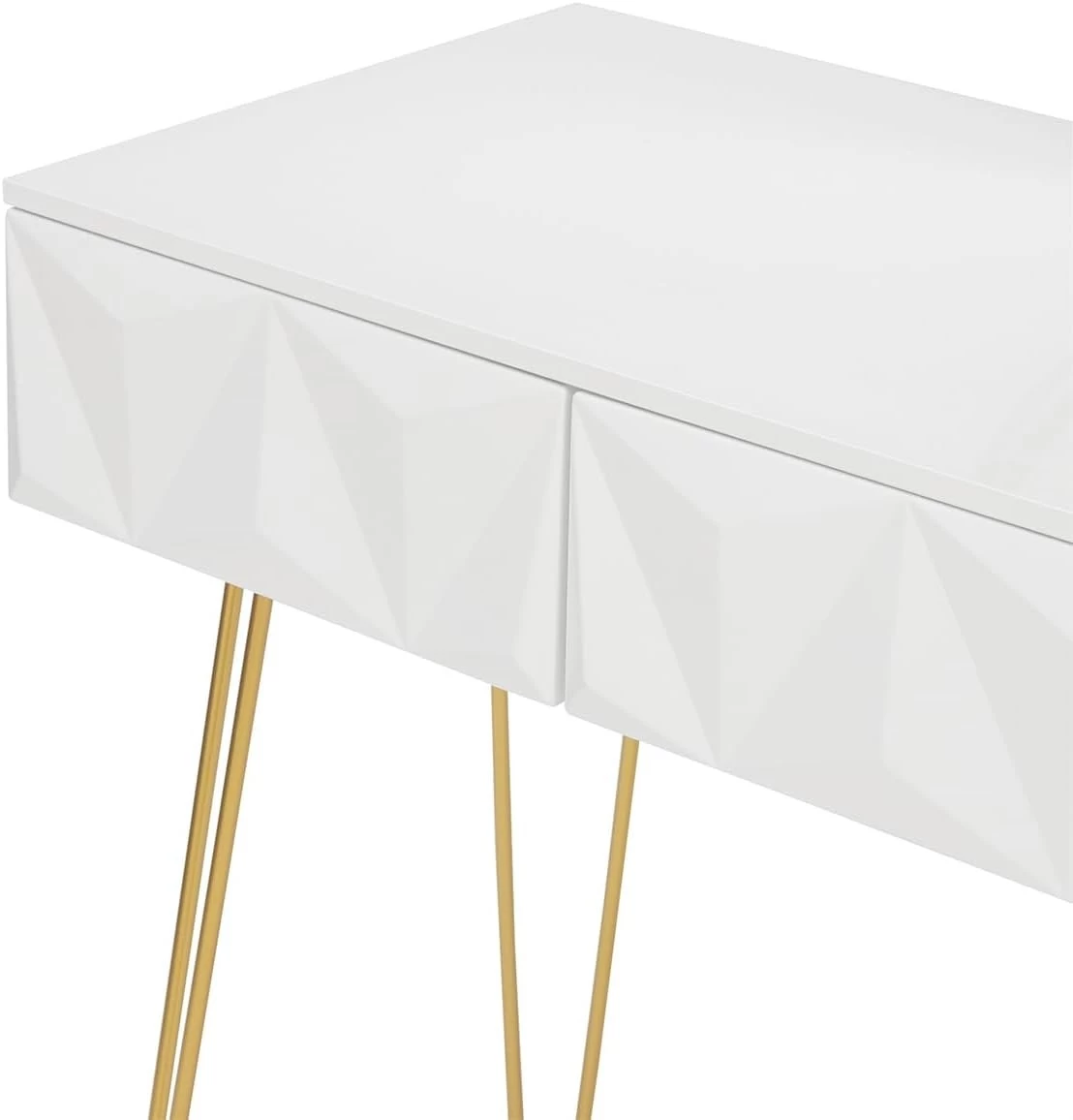 - Ein auffälliges Design: Der schlichte Look und die Kombination aus Weiß, Gold und Rosa machen das Schminktisch-Set elegant und stilvoll. Die goldenen Haarnadelbeine und das Rautenmuster auf den Schubladen verleihen dem Set einen Hauch von Luxus