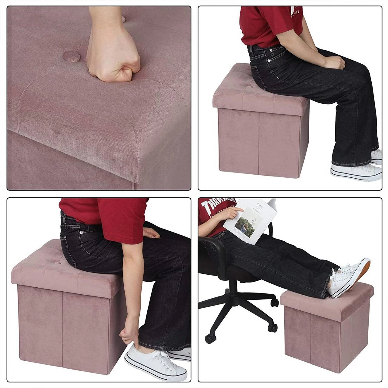 Ohne Werkzeug ist dieser faltbare Würfel leicht zu montieren, Sie können die Installation in Sekundenschnelle abschließen. Die Demontage ist ebenfalls sehr einfach, wenn er nicht in Gebrauch ist, können Sie ihn mühelos zusammenfalten. Nach dem Falten nimmt der flache Hocker nicht viel Platz weg.