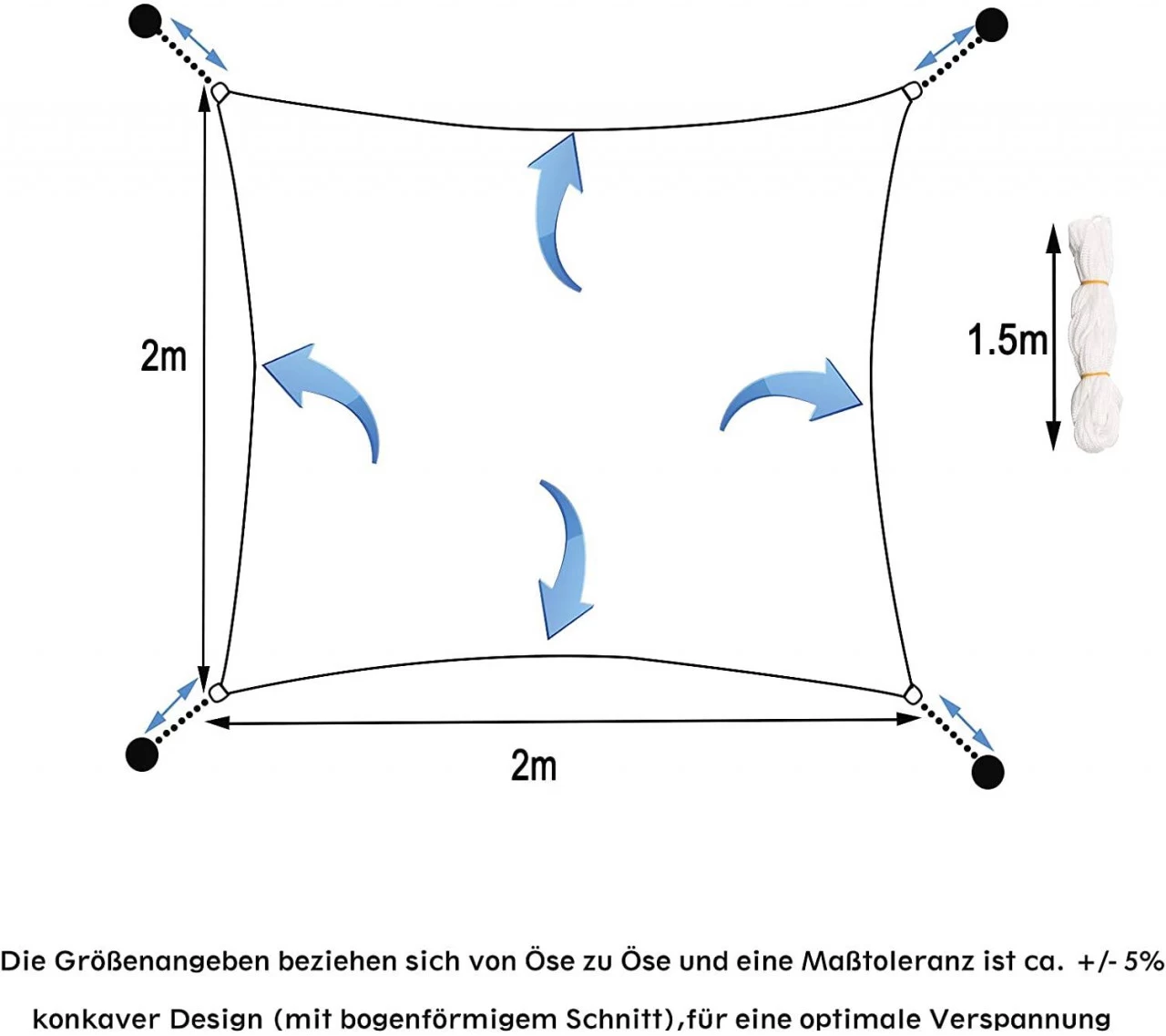- Hinweise: *Bitte achten Sie bei den Abmessungen des Segels, dass Sie mind. 35 cm und max. 100 cm Abstand zwischen Segelecken und Befestigungspunkten haben. Damit ermöglicht das Anbringen eine optimale Spannung. *Die Größenangeben beziehen sich von Öse zu Öse (beim voll gespanntem Segel) und haben eine Maßtoleranz von ca. +/- 5%. *Die Schattenfläche ist aufgrund der konkaven Form kleiner als die angegebenen Maße.