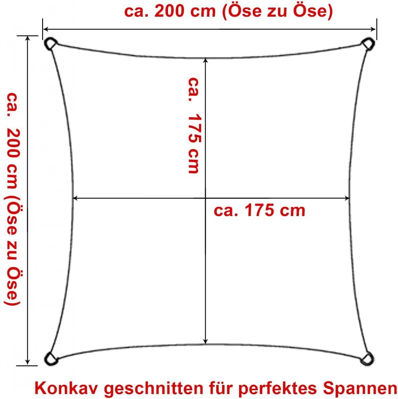 - Hinweise: 1. Bitte achten Sie bei den Abmessungen des Segels, dass Sie mind. 35 cm und max. 100 cm Abstand zwischen Segelecken und Befestigungspunkten haben. Damit ermöglicht das Anbringen eine optimale Spannung. 2. Die Größenangeben beziehen sich von Öse zu Öse (beim voll gespanntem Segel) und haben eine Maßtoleranz von ca. +/- 5%. 3. Die Schattenfläche ist aufgrund der konkaven Form kleiner als die angegebenen Maße.