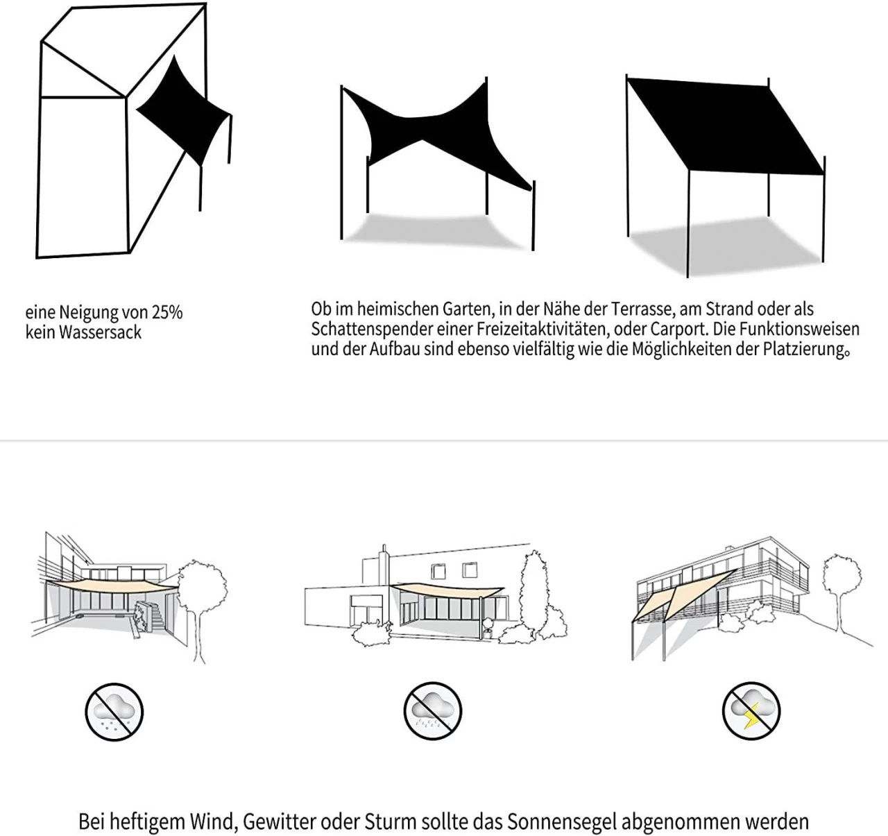- Um eine lange Anwendung empfehlen wir Ihnen, bei heftigem Wind, Gewitter oder Sturm, das Sonnensegel abgenommen werden sollte.