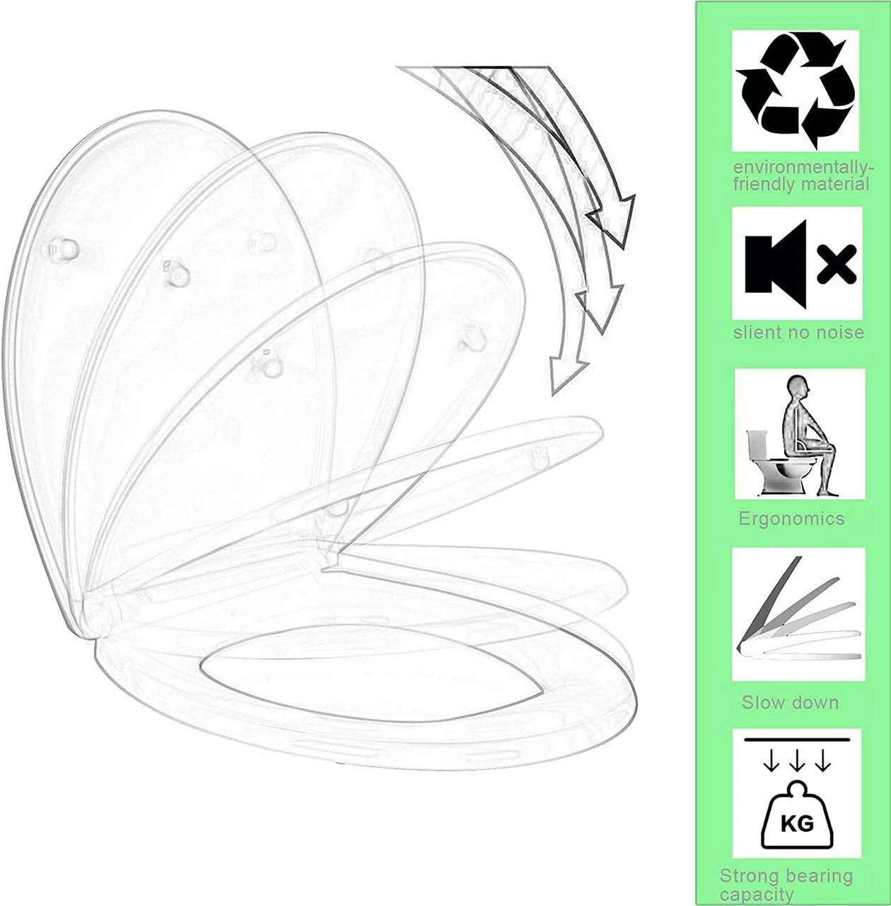 • Durch das geräuschlose Schließen macht der Klodeckel während der Benutzung keine Geräusche. Die ganze Familie kann die ganze Nacht friedlich schlafen.