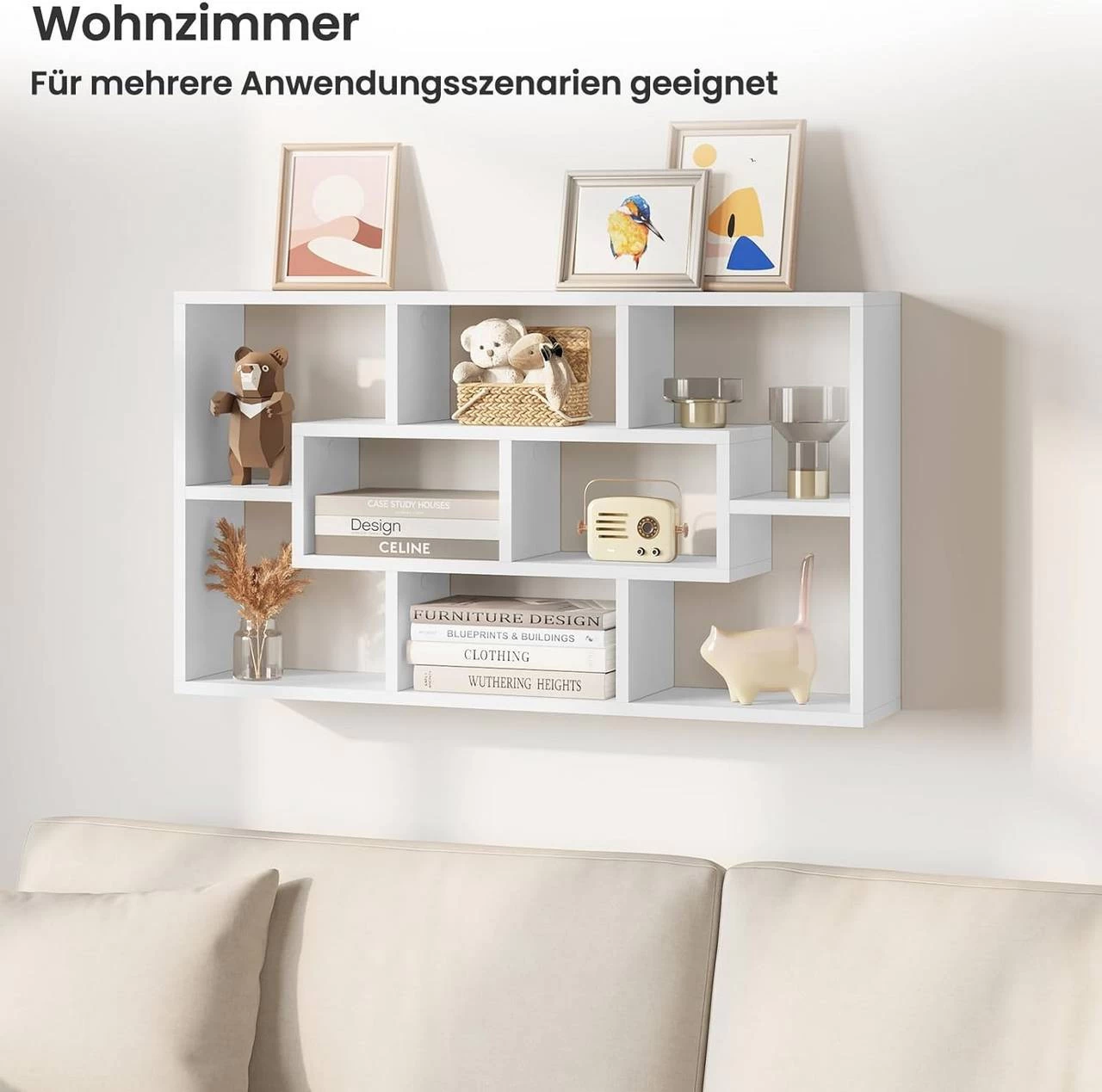 - DEKORATION & LAGERUNG 2-IN-1: Das Wandregal mit 8 Fächern ist eine absolute Wanddeko, schafft aber auch ausreichend Platz für die Aufbewahrung und Präsentation Ihrer Bilderrahmen, Figuren, Spielzeug, Bücher, Puppen, CDs, DVDs, Topfpflanzen usw.