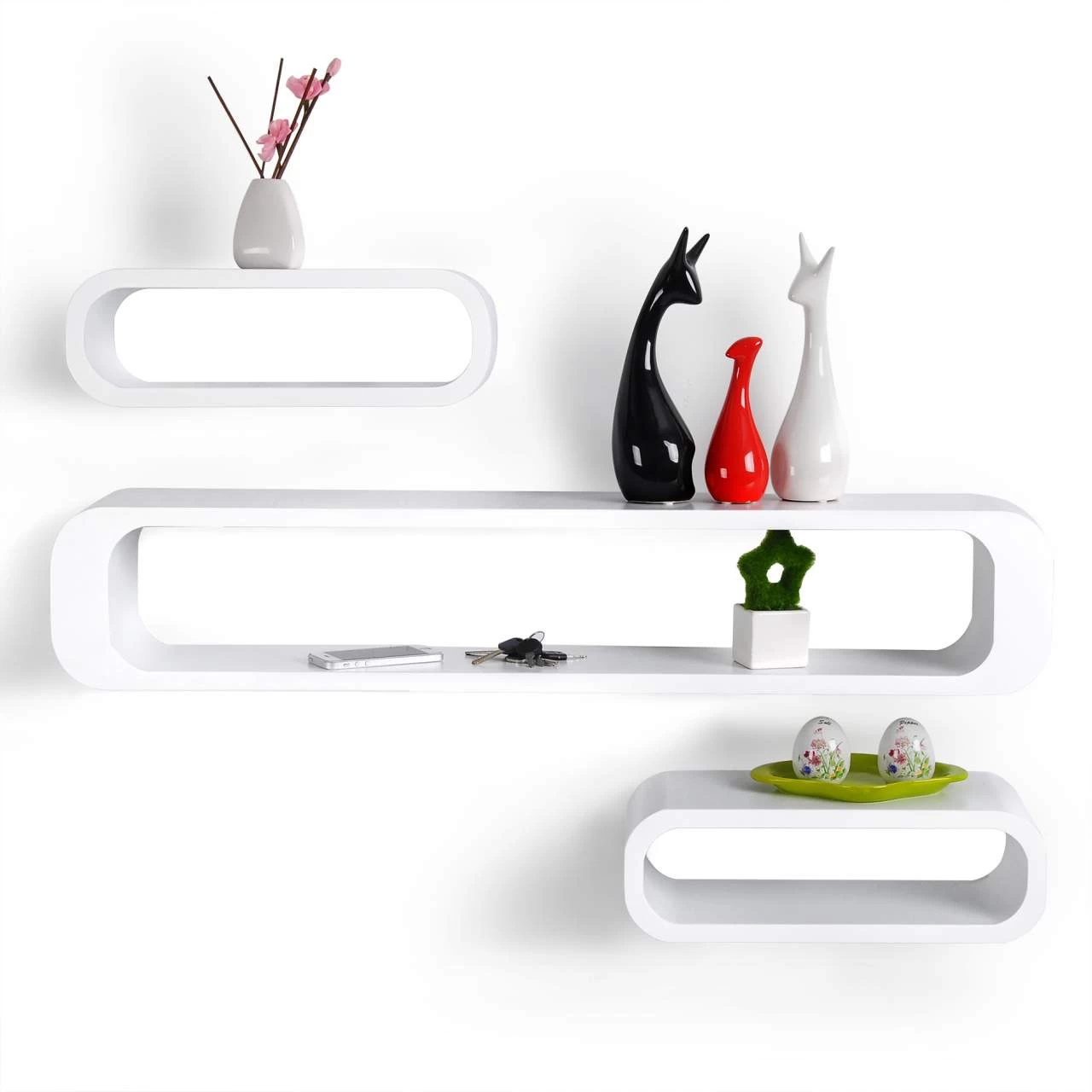 - 5-Schicht-Lackierung Verarbeitung, um die Platten gleichmäßig und glatt zu sein. Es sieht sehr gehoben aus und verleihen Sie eine große Raumvorstellung. Vielseitig einsetzbar – für Bücher, CDs, Blumen und andere Kleinigkeiten.Sie können das Regal überall verwenden, egal ob im Wohnzimmer, Büro, Schlafzimmer, Badezimmer, Kinderzimmer, Flur oder in der Küche. Es harmoniert wunderbar mit modernen Einrichtungsstilen
