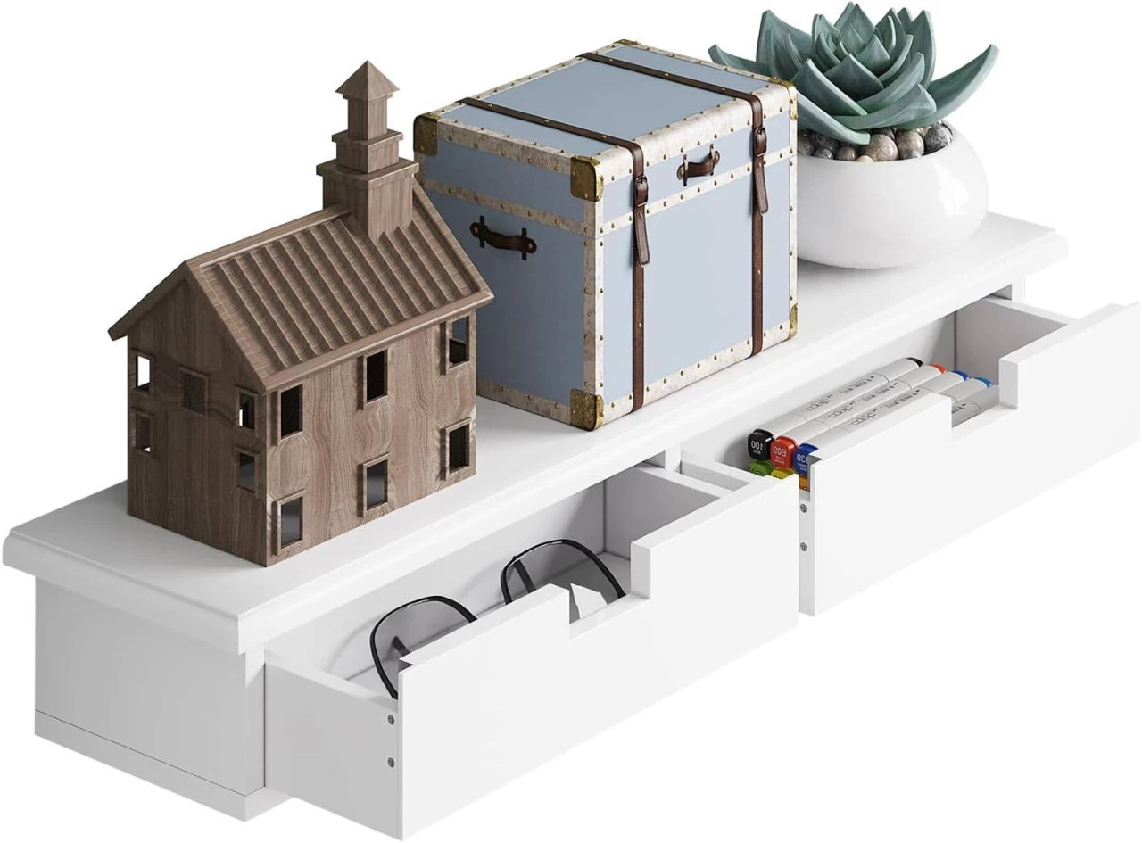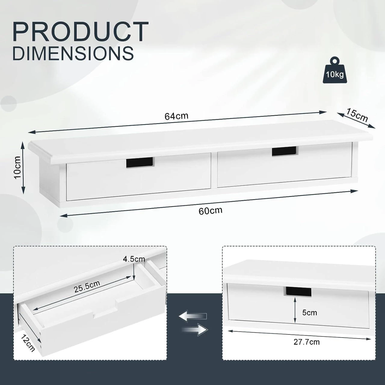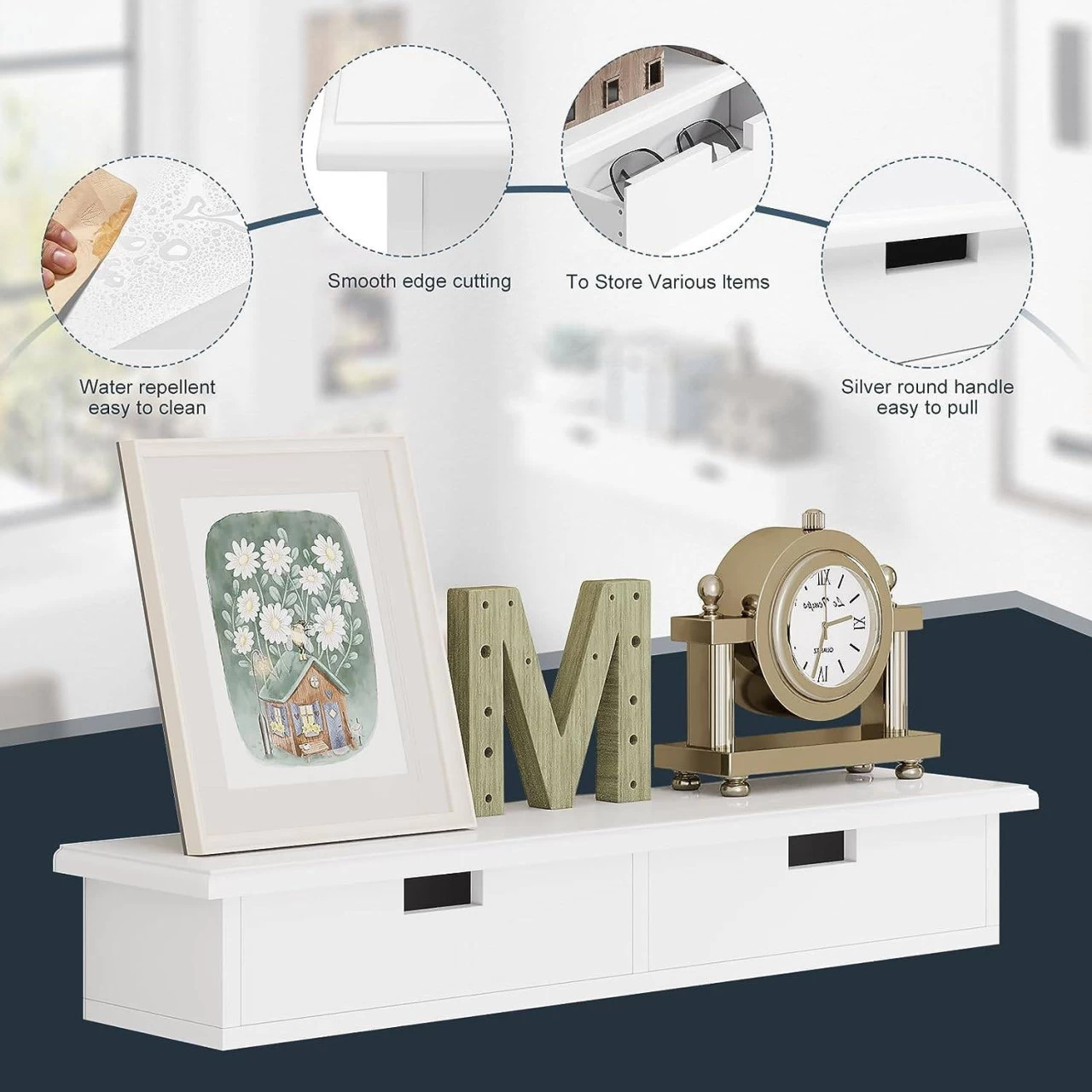 - 1 Ablage & 2 Schubladen: Dieses einfach gestaltete Wandregal verfügt über 3 Stauräume: eine Ablagefläche, um Gegenstände zu präsentieren und griffbereit zu halten; 2 Schubladen, um Gegenstände staubfrei aufzubewahren