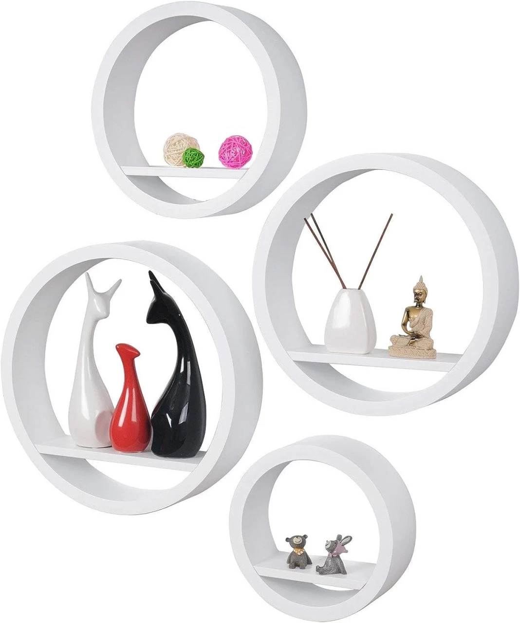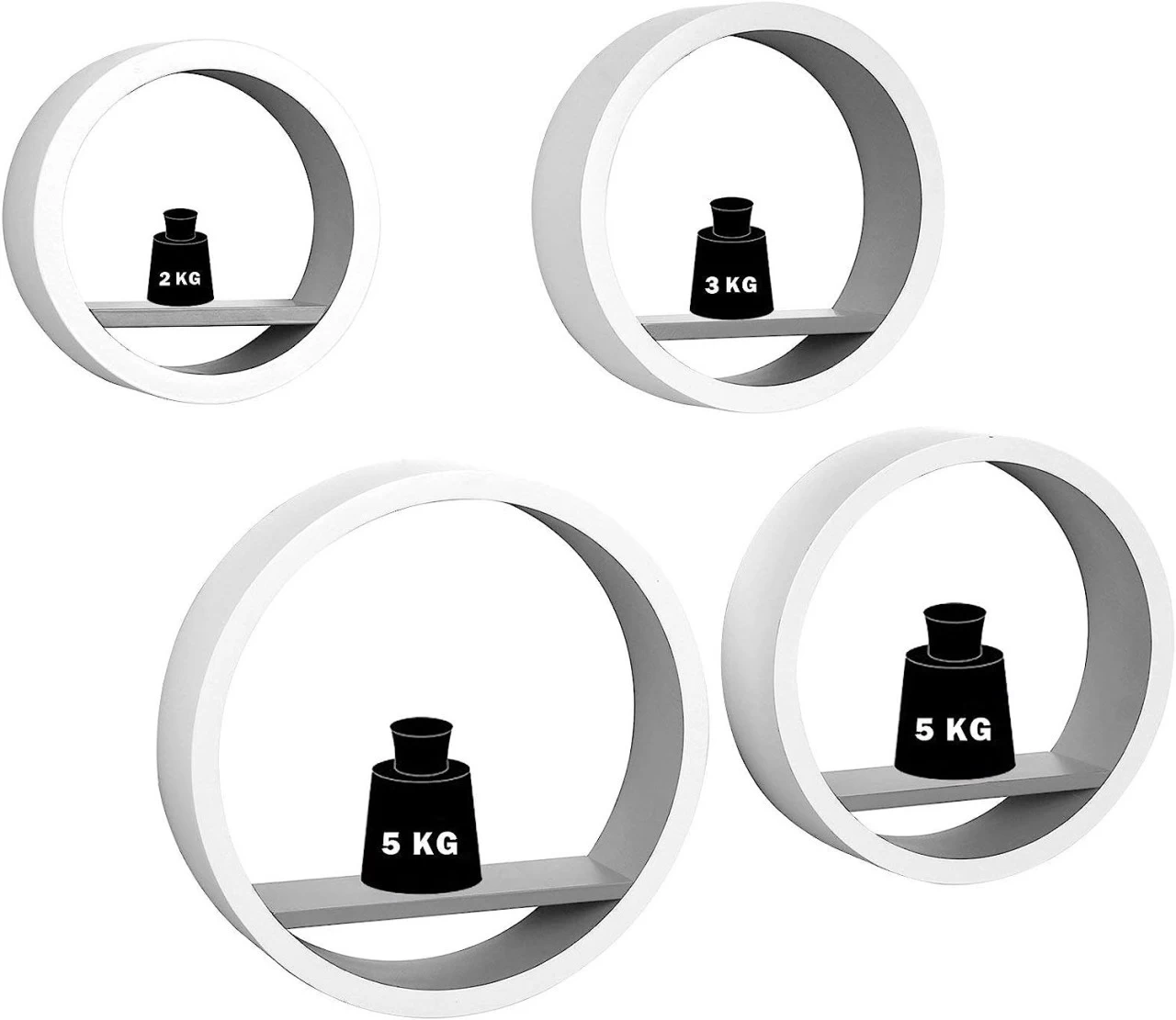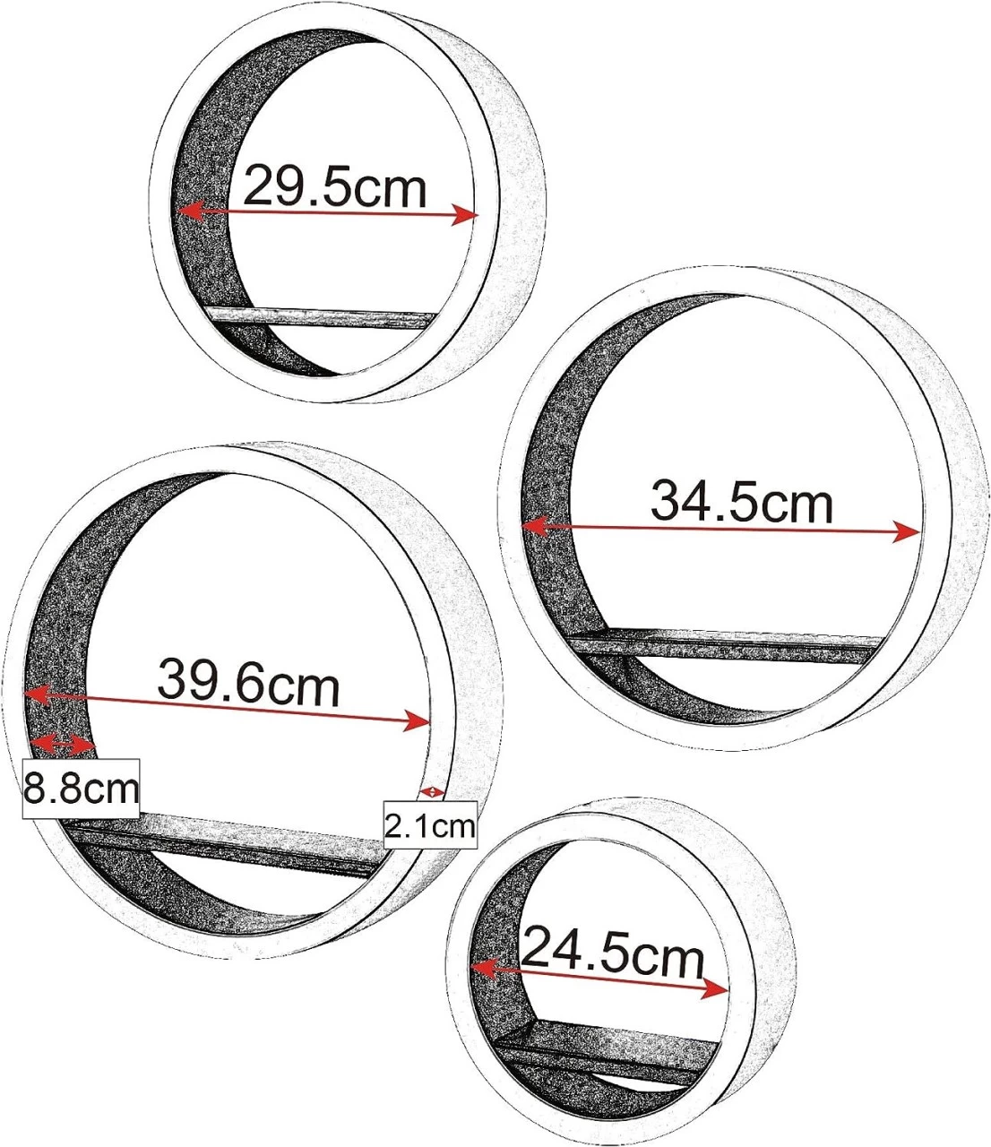 - Besteht aus 4 Wandregalen: Größe XL: Ø 39,6 cm/Tiefe 8,8 cm,Einlegeböden Länge: 28 cm L:Ø 34,5 cm/Tiefe: 8,8 cm,Einlegeboden Länge:23,9 cm M: Ø 29,5 cm/Tiefe: 8,8 cm, Einlegeboden Länge:20 cmS: Ø 24,5 cm/Tiefe: 8,8 cm, Einlegeboden Länge:17 cm, Mit Plattenstärke von 2.1cm ist das Set stark und stabil.