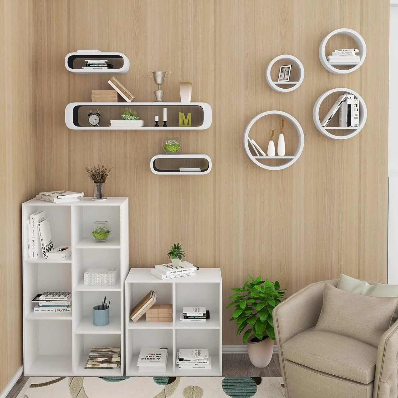 - 5-Schicht-Lackierung Verarbeitung, um die Platten gleichmäßig und glatt zu sein. Es sieht sehr gehoben aus und verleihen Sie eine große Raumvorstellung. Vielseitig einsetzbar – für Bücher, CDs, Blumen und andere Kleinigkeiten.Sie können das Regal überall verwenden, egal ob im Wohnzimmer, Büro, Schlafzimmer, Badezimmer, Kinderzimmer, Flur oder in der Küche. Es harmoniert wunderbar mit modernen Einrichtungsstilen