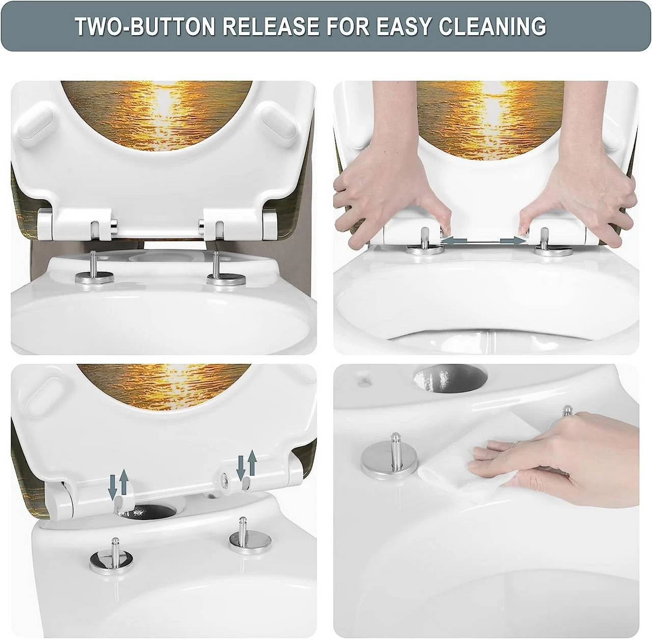 Quick-Release-Funktion für einfache Reinigung: Für eine gründliche Reinigung müssen Sie nur den Sitz senkrecht hochklappen, die beiden Druckknöpfe drücken und den Deckel hochziehen. Nach der Reinigung müssen Sie den Toilettensitz nur noch senkrecht zurückschieben.