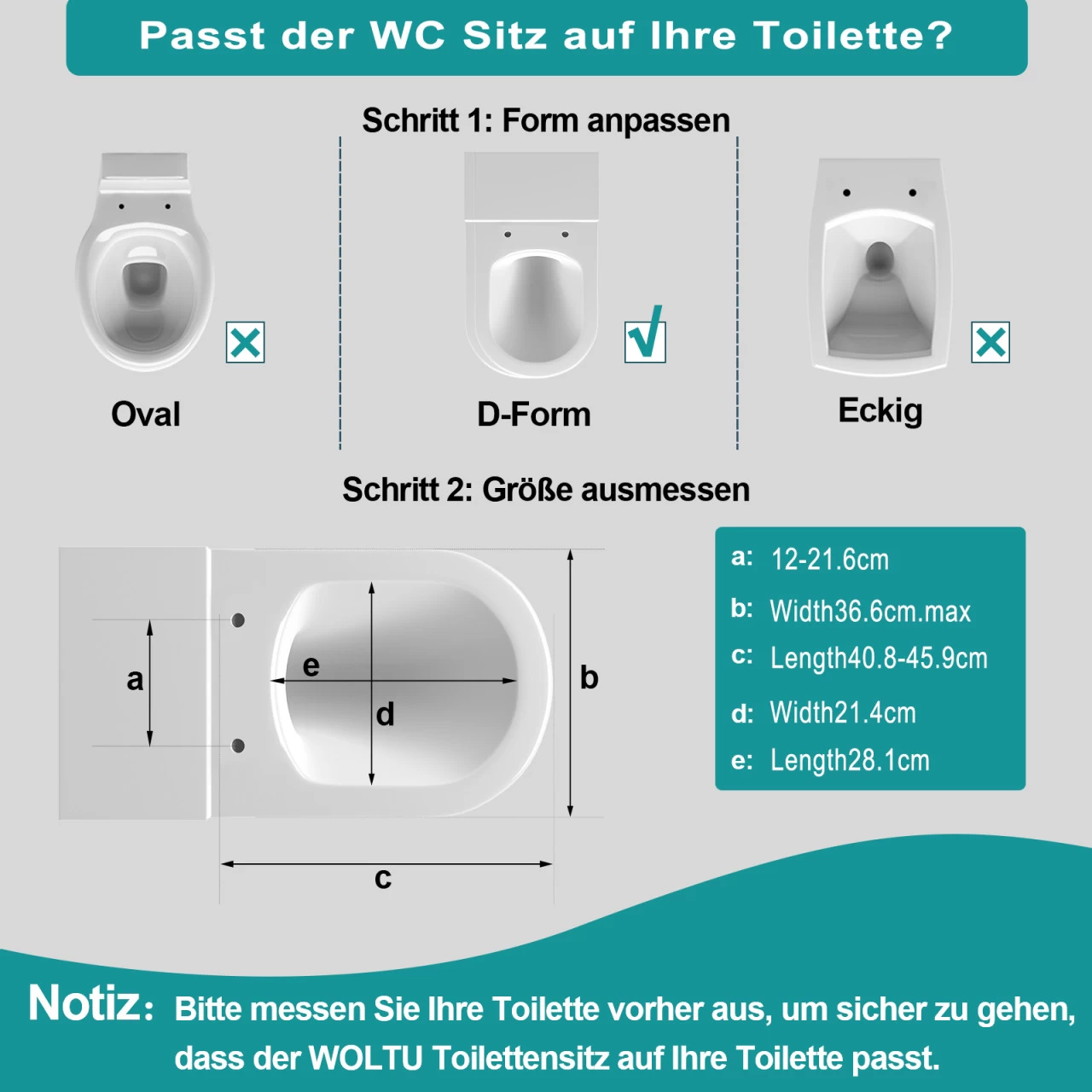 - Stellen Sie vor dem Kauf sicher, dass der WC-Sitz der Form Ihrer Toilettenschüssel entspricht.