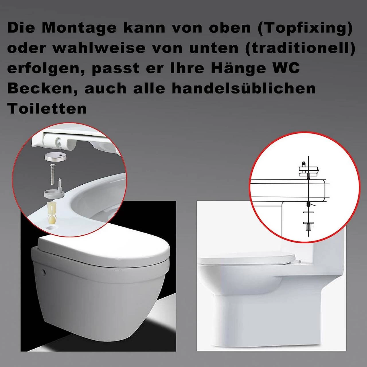 - Montagefreundlich: Das Montagematerial ist im Lieferumfang enthalten. Die Montage kann von oben (Topfixing) oder wahlweise von unten (traditionell) erfolgen; passend auf O Toiletten.Bitte beachten Sie: Bitte messen Sie vor dem Kauf Ihre Toilettengröße