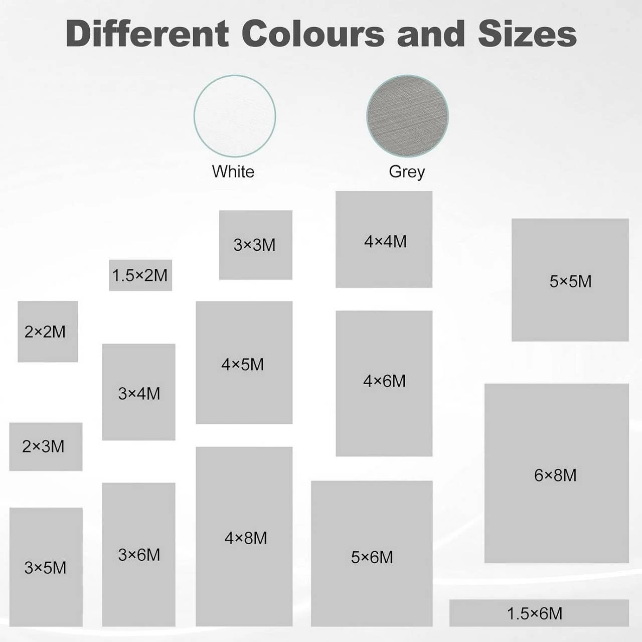 - Große Auswahl an Farben und Größen: Verfügbare Größen: 2×3 m / 3×4 m / 4×8 m / 3×5 m / 3×6 m / 4×5 m / 4×6 m / 5×6 m / 6×8 m/ 1,5×10 m. Verfügbare Farben: Weiß, Grau, Grau-Schwarz, Grau-Grün. Ihre unterschiedlichen Vorstellungen und Anforderungen können gleichzeitig erfüllt werden.