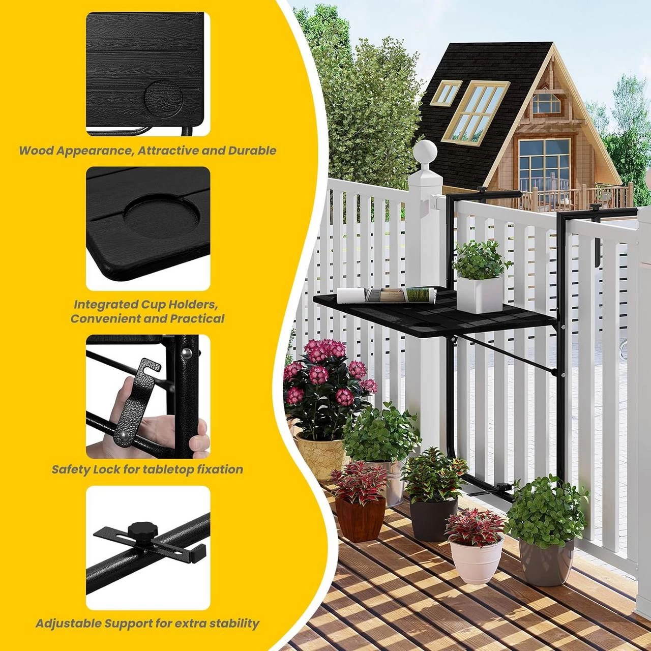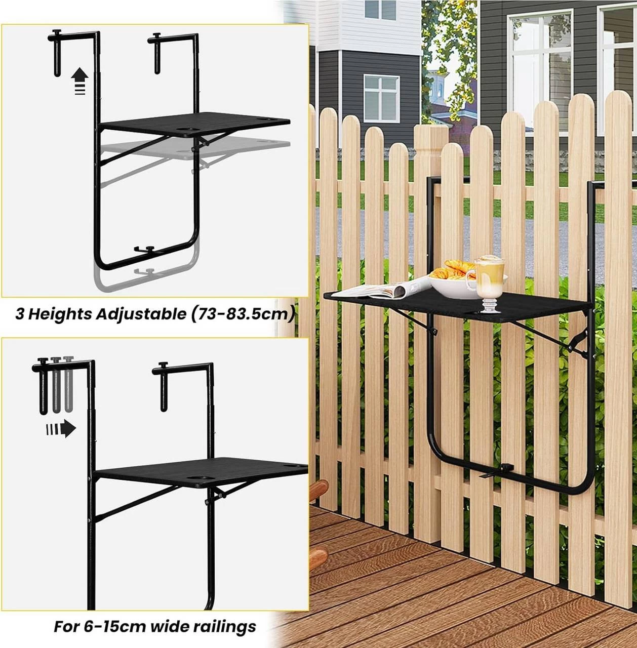 - FLEXIBLE EINSTELLUNG: Durch Verstellen der beiden Schraubknöpfe können Sie den Hängetisch an Geländer, Zaun oder Wand (Dicke: 6-15 cm) befestigen. Außerdem ist er in 3 Stufen höhenverstellbar (73-78,5-83,5 cm), um den Zugang zu erleichtern,