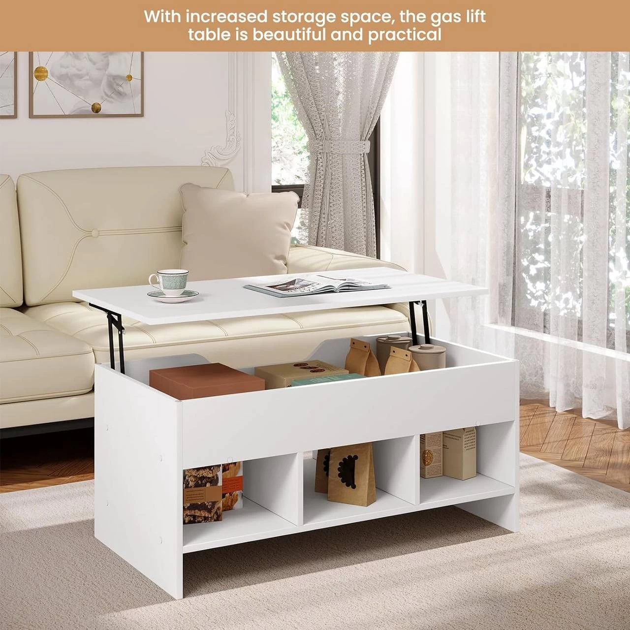 - LIFT-COUCHTISCH: Bei angehobener Tischplatte dient der Tisch als Schreibtisch, Computertisch oder kleiner Esstisch, das Verstauen und Erreichen der Gegenstände ist auch leicht. Bei klappbarer Tischplatte ist er Kaffeetisch, Sofatisch, Beistelltisch.