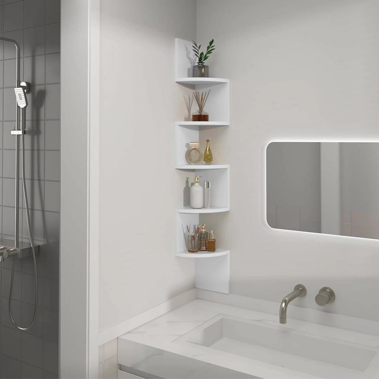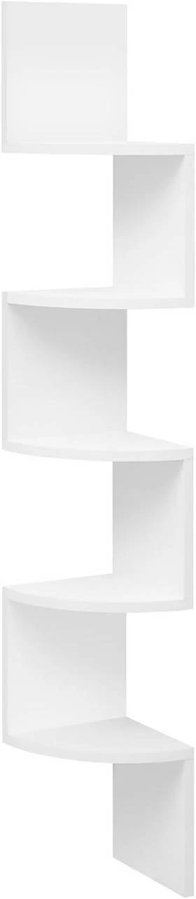 Optimierter Stauraum: Durch die geschickte Ausnutzung der Ecke und des vertikalen Raums bietet das Regal 5 offene Ebenen für Kleinigkeiten und sorgt so für mehr Ordnung.